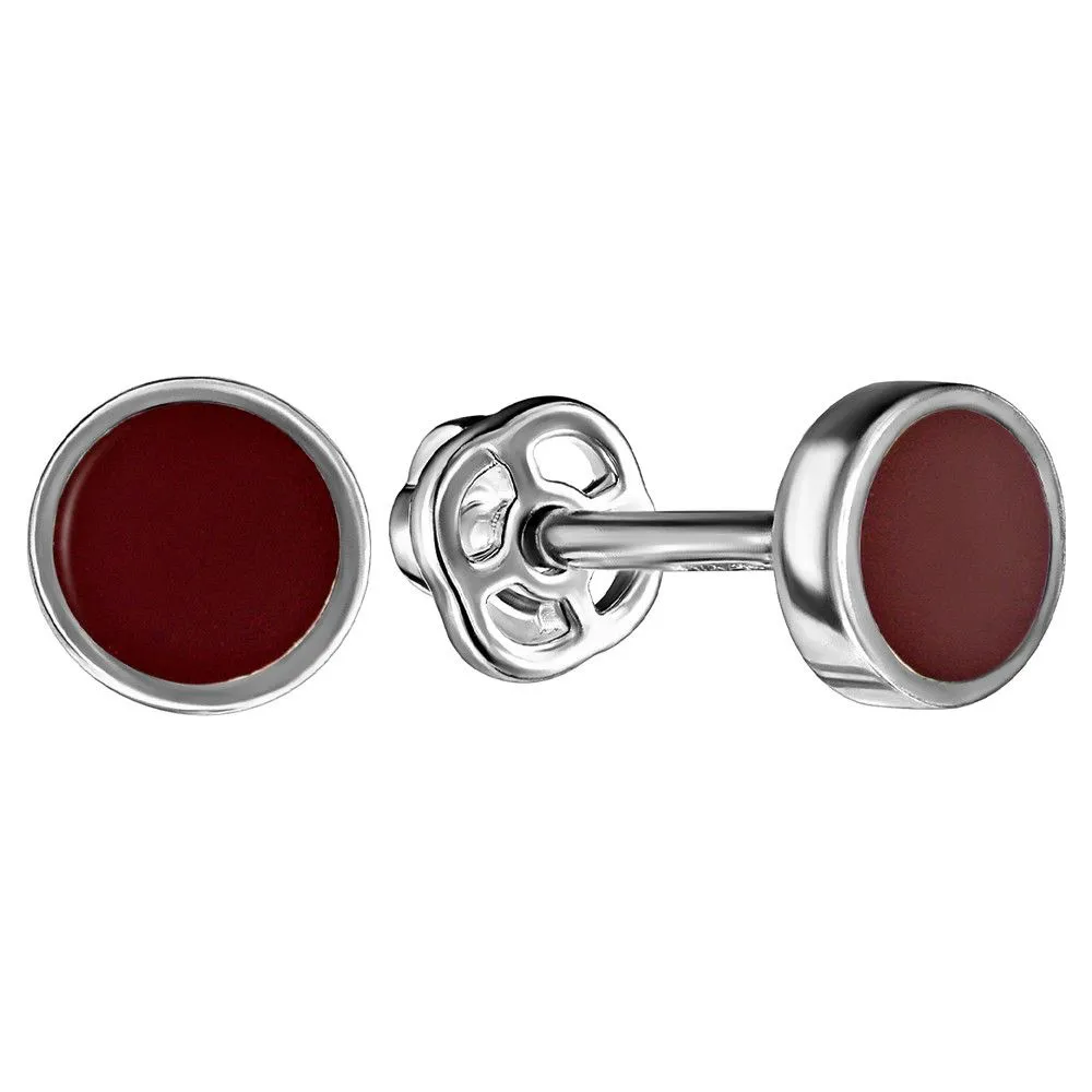 Серебряные серьги гвоздики (пусеты) с эмалью - цвет бордовый / Палладий. Средний вес ювелирного украшения 0.86 гр. Эмаль – холодная двухкомпонентная итальянская эмаль высокого качества. Имеет высокую степень устойчивости к царапинам и солнечному свету, ударам и механическим повреждениям.< /p> Все изделия собственного производства и имеют гарантию 12 месяцев. Арт. 8613PD.