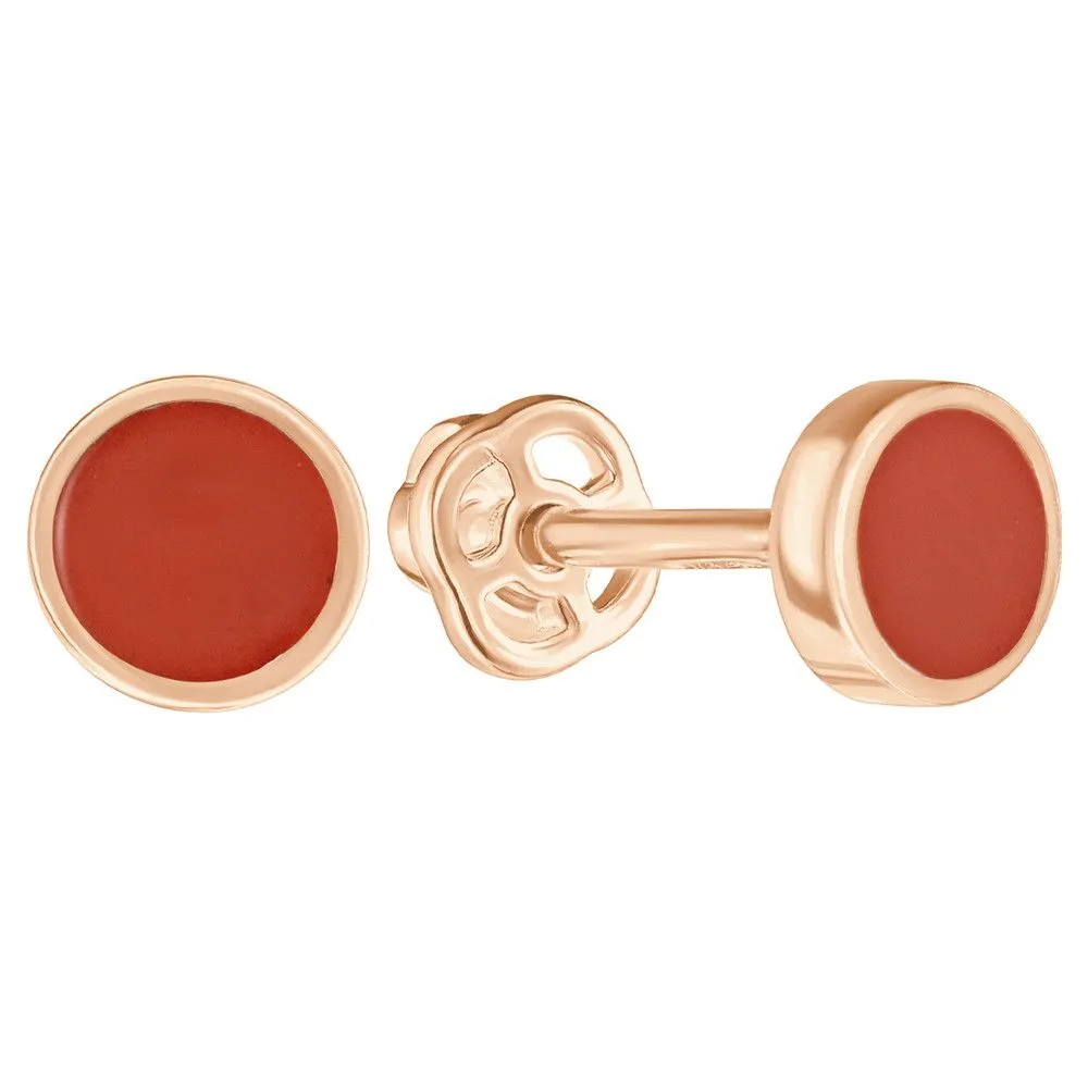 Серебряные серьги гвоздики (пусеты) с эмалью - цвет оранжевый / Красное золото. Средний вес ювелирного украшения 0.86 гр. Эмаль – холодная двухкомпонентная итальянская эмаль высокого качества. Имеет высокую степень устойчивости к царапинам и солнечному свету, ударам и механическим повреждениям.< /p> Все изделия собственного производства и имеют гарантию 12 месяцев. Арт. 8614RG.