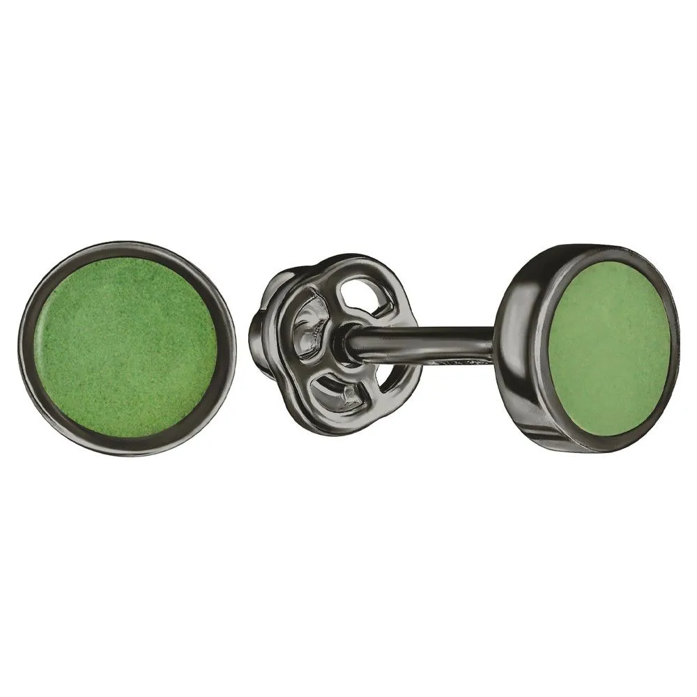 Серебряные серьги гвоздики (пусеты) с эмалью - цвет фисташковый / Черный Родий. Средний вес ювелирного украшения 0.86 гр. Эмаль – холодная двухкомпонентная итальянская эмаль высокого качества. Имеет высокую степень устойчивости к царапинам и солнечному свету, ударам и механическим повреждениям.< /p> Все изделия собственного производства и имеют гарантию 12 месяцев. Арт. 8617BR.