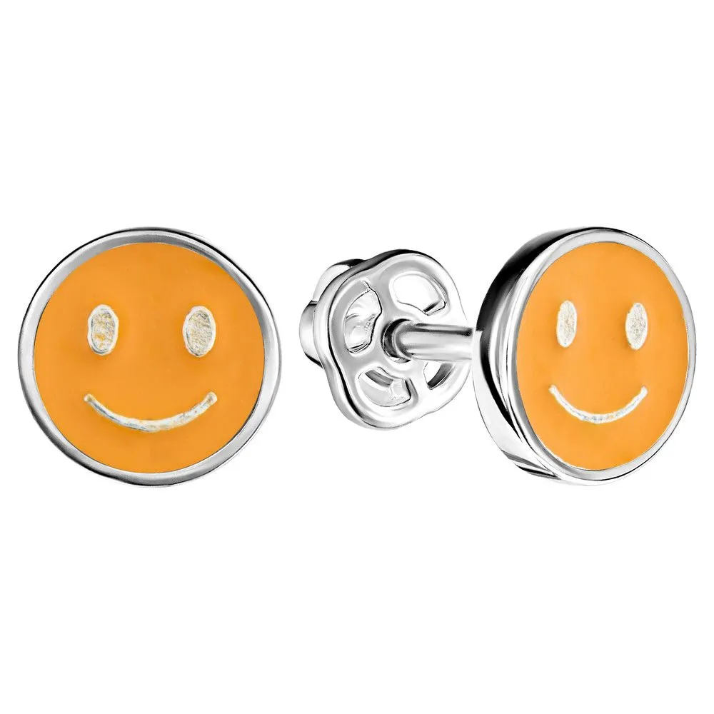 Серебряные серьги гвоздики Смайлик с эмалью - цвет желто-оранжевый / Белый Родий. Средний вес ювелирного украшения 1.23 гр. Эмаль – холодная двухкомпонентная итальянская эмаль высокого качества. Имеет высокую степень устойчивости к царапинам и солнечному свету, ударам и механическим повреждениям.< /p> Все изделия собственного производства и имеют гарантию 12 месяцев. Арт. 8839WR.