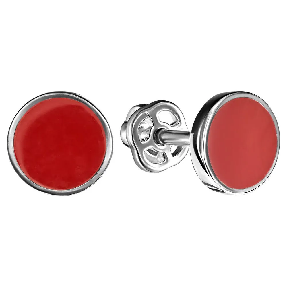 Серебряные серьги гвоздики (пусеты) с эмалью - цвет красный / Палладий. Средний вес ювелирного украшения 1.27 гр. Эмаль – холодная двухкомпонентная итальянская эмаль высокого качества. Имеет высокую степень устойчивости к царапинам и солнечному свету, ударам и механическим повреждениям.< /p> Все изделия собственного производства и имеют гарантию 12 месяцев. Арт. 8841PD.