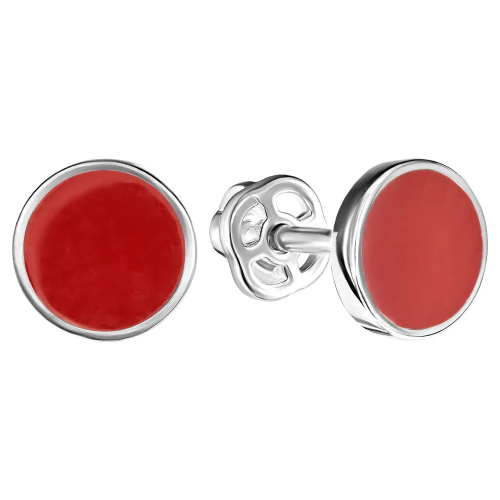 Серебряные серьги гвоздики (пусеты) с эмалью - цвет красный / Белый Родий. Средний вес ювелирного украшения 1.27 гр. Эмаль – холодная двухкомпонентная итальянская эмаль высокого качества. Имеет высокую степень устойчивости к царапинам и солнечному свету, ударам и механическим повреждениям.< /p> Все изделия собственного производства и имеют гарантию 12 месяцев. Арт. 8841WR.