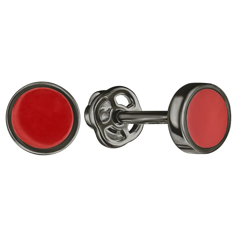 Серебряные серьги гвоздики (пусеты) с эмалью - цвет красный / Черный Родий. Средний вес ювелирного украшения 0.86 гр. Эмаль – холодная двухкомпонентная итальянская эмаль высокого качества. Имеет высокую степень устойчивости к царапинам и солнечному свету, ударам и механическим повреждениям.< /p> Все изделия собственного производства и имеют гарантию 12 месяцев. Арт. 8846BR.