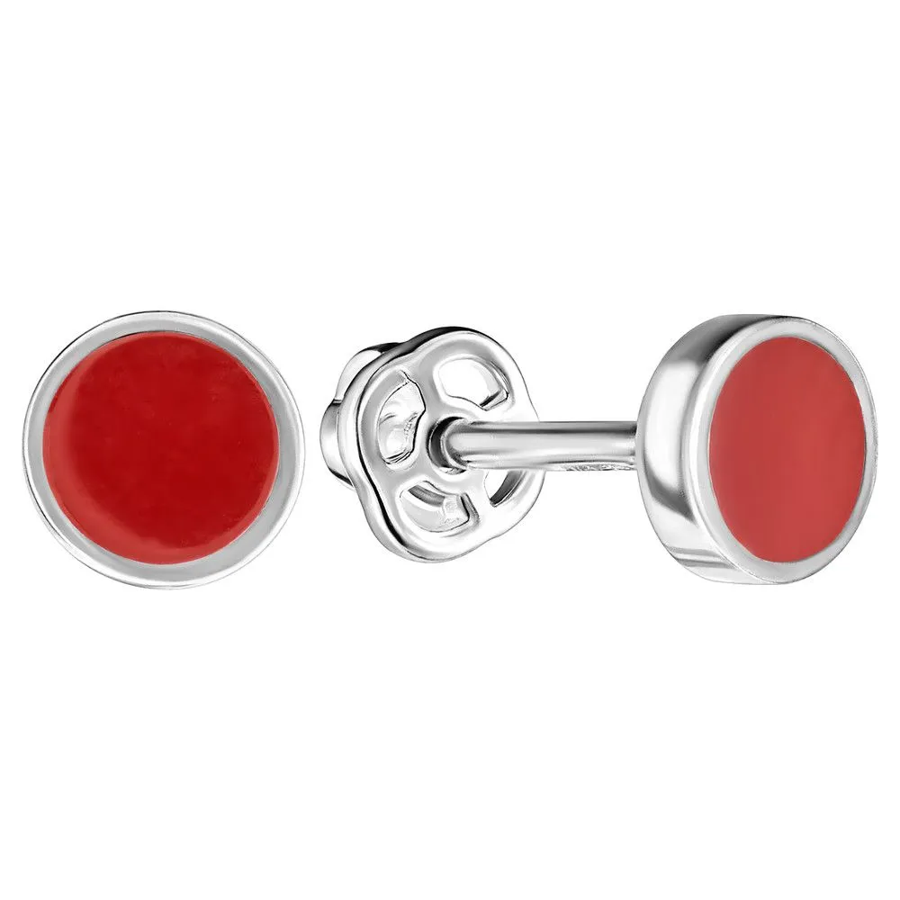 Серебряные серьги гвоздики (пусеты) с эмалью - цвет красный / Белый Родий. Средний вес ювелирного украшения 0.86 гр. Эмаль – холодная двухкомпонентная итальянская эмаль высокого качества. Имеет высокую степень устойчивости к царапинам и солнечному свету, ударам и механическим повреждениям.< /p> Все изделия собственного производства и имеют гарантию 12 месяцев. Арт. 8846WR.