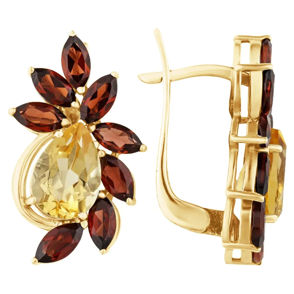Стильные серебряные серьги "Элегия", с натуральными камнями цитрин и гранат, покрытие Желтое Золото. Средний вес украшения с камнями: 7,05 гр. Месторождение(я) камней: Натуральные камни: Цитрин (Урал, Россия), Гранат (Кольский п-ов, Россия). Цитрин (Натуральный) груша: 7*10 мм. средний вес 1,85 карат. Гранат (Натуральный) маркиз: 3*6 мм., средний вес 0,35 карат. Размер лицевой части: 15*24 мм. Все изделия собственного производства и имеют гарантию 12 месяцев, к каждому изделию прилагается паспорт. Арт. 6253YG