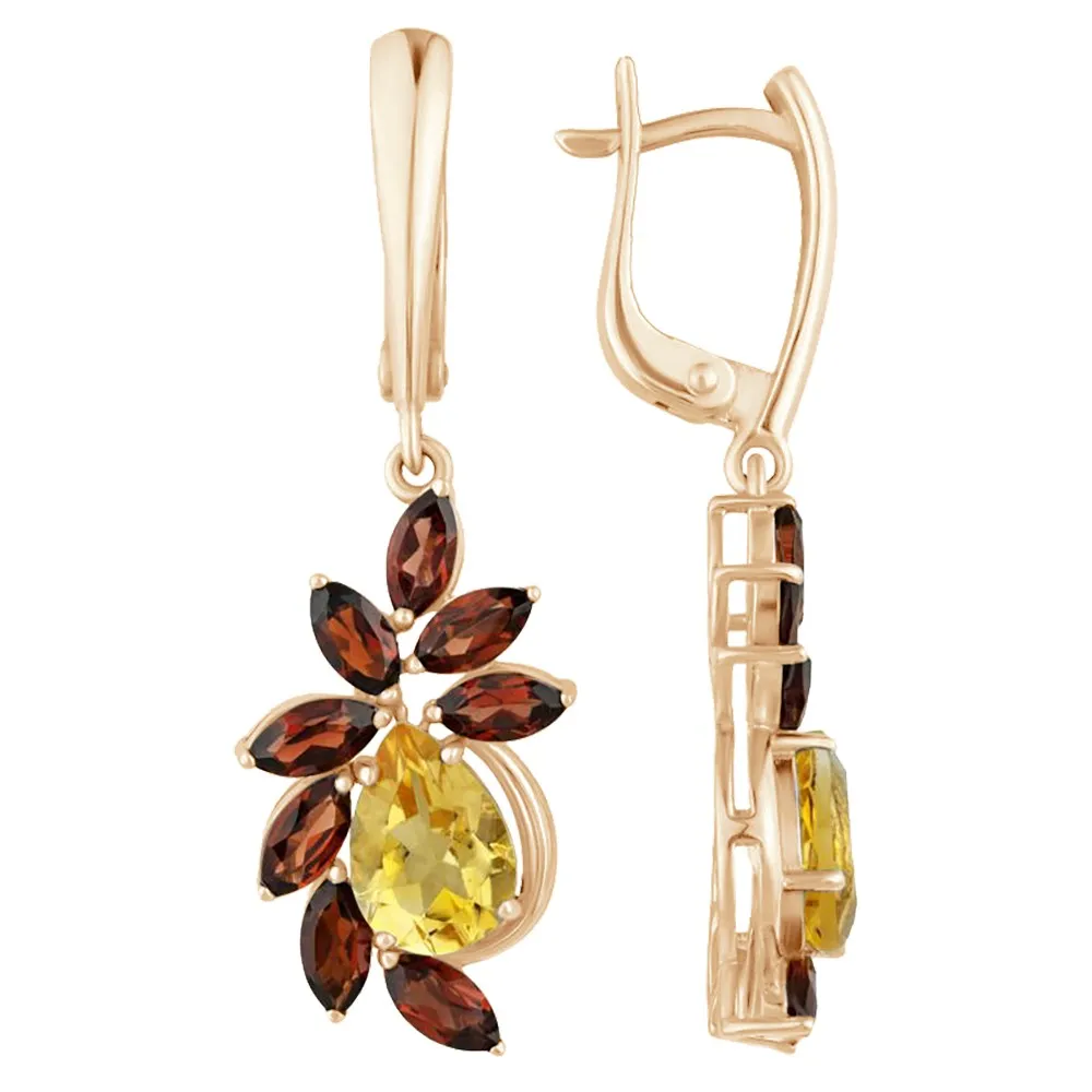 Стильные серебряные серьги "Элегия", с натуральными камнями цитрин и гранат, покрытие Розовое Золото. Средний вес украшения: 7,68 гр. Месторождение(я) камней: Цитрин (Урал, Россия), Гранат (Кольский п-ов, Россия). Цитрин (Натуральный) груша: 7*10 мм. средний вес 1,85 карат. Гранат (Натуральный) маркиз: 3*6 мм., средний вес 0,35 карат. Размер лицевой части: 15*43 мм. Все изделия собственного производства и имеют гарантию 12 месяцев, к каждому изделию прилагается паспорт. Арт. 6254PG