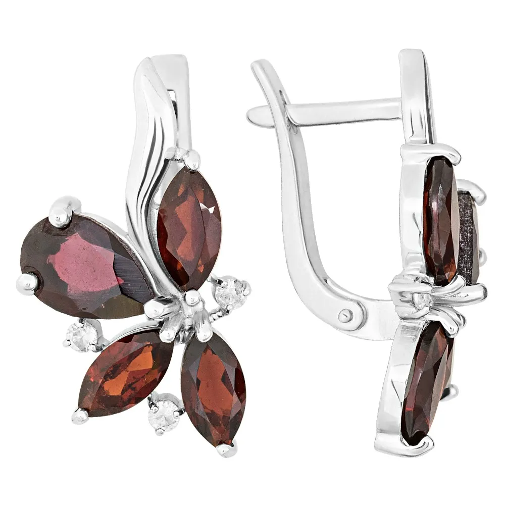 Серебряные серьги "Аврора" с натуральным гранатом, без покрытия. Средний вес украшения с камнями 7,62 гр. Месторождение(я) камней: Гранат (Кольский п-ов, Россия). Гранат (Натуральный) маркиз: 4*8 мм., средний вес 0,75 карат. Гранат (Натуральный) груша: 6*9 мм., средний вес 1,45 карат.