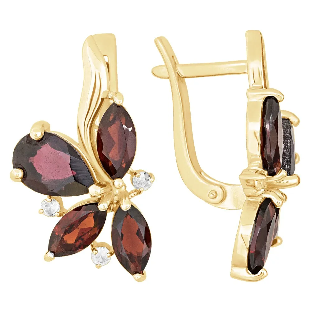 Серебряные серьги "Аврора" с натуральным гранатом, покрытие Желтое Золото. Средний вес украшения с камнями 7,62 гр. Месторождение(я) камней: Гранат (Кольский п-ов, Россия). Гранат (Натуральный) маркиз: 4*8 мм., средний вес 0,75 карат. Гранат (Натуральный) груша: 6*9 мм., средний вес 1,45 карат.