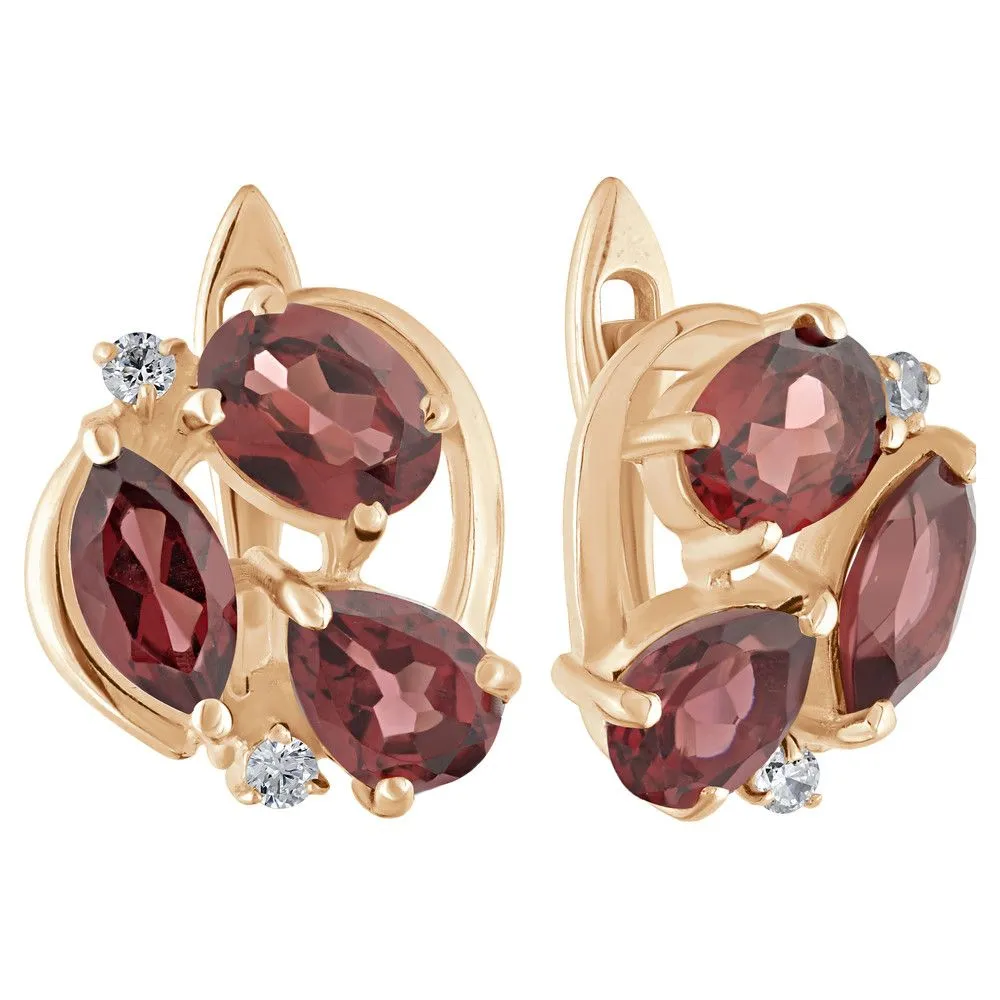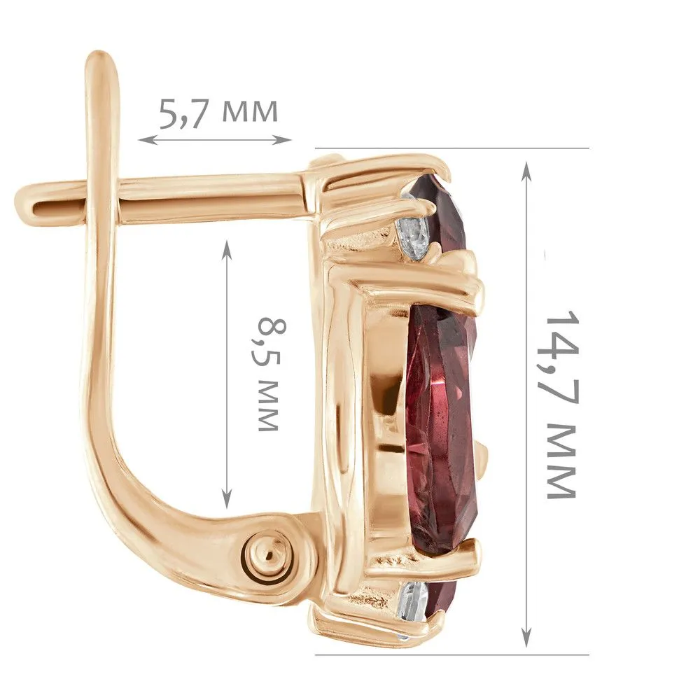 Серебряные серьги с натуральным гранатом - коллекция Фортуна / покрытие Розовое Золото. Средний вес украшения с камнями 5.75 гр. Месторождение: Гранат (Кольский п-ов, Россия) Ювелирные вставки: Гранат (Натуральный) груша 5*7 мм., средний вес: 0.79 карат. Гранат (Натуральный) овал 5*7 мм., средний вес: 0.95 карат. (Натуральный) круг 2 мм., средний вес: 0.06 карат. Все изделия собственного производства и имеют гарантию 12 месяцев. Арт. 8776PG . Гранат называют камнем любви. Он дарит своим обладательницам мудрость, а владельцам – решительность и храбрость. Данному камню присущи лечебные свойства, давным-давно он использовался при ранениях. Считалось, что он помогает поддерживать связь с миром мертвых.