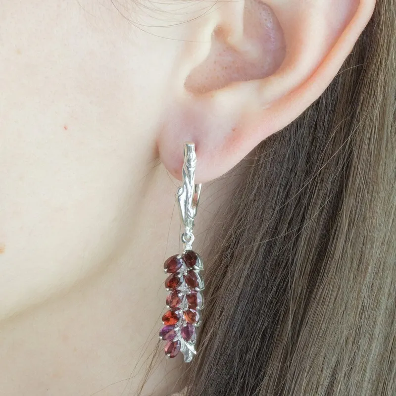 Серебряные серьги с натуральным гранатом - коллекция Флора. Средний вес изделия с камнями 7.85 гр. Месторождение(я): Гранат (Кольский п-ов, Россия). Гранат (Натуральный) овал 3*5 мм., средний вес: 0.37 карат. Размер лицевой части: 9*48 мм. Все изделия собственного производства. Гарантия 12 месяцев.Арт. 7853
