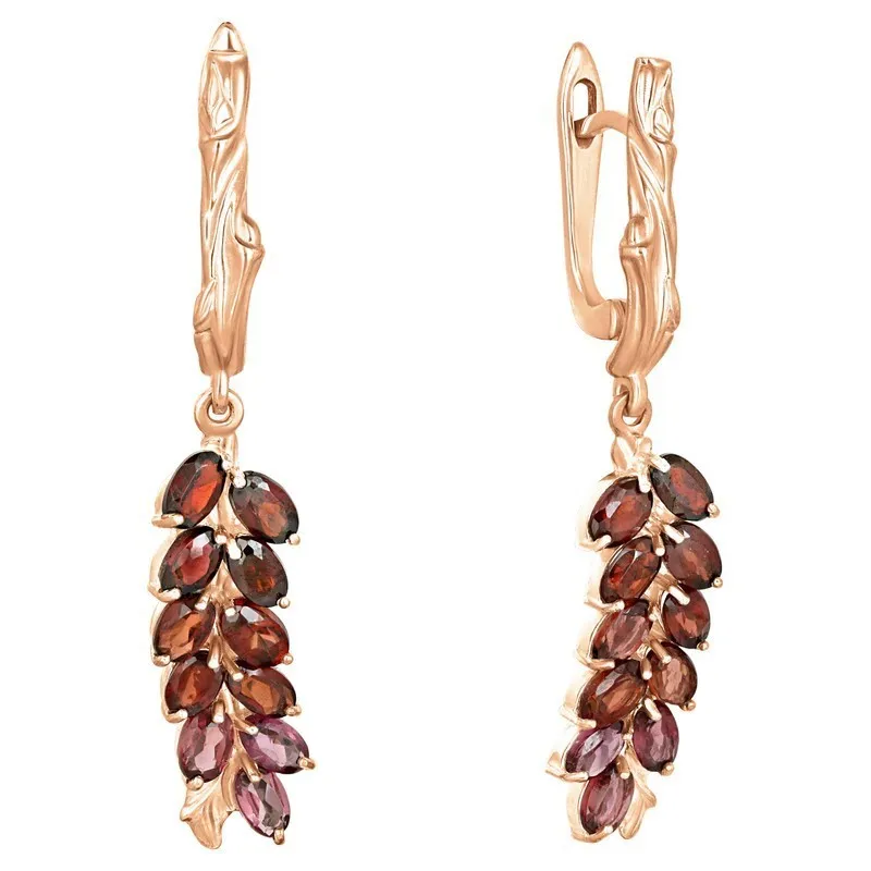 Серебряные серьги с натуральным гранатом - коллекция Флора. Серебряные серьги 925 пробы с покрытием красное золото. Цвет покрытия соответствует швейцарскому цветовому стандарту NIHS -5N и цвету красного золота 585 в России. На последней фотографии мы разместили сравнительную фотографию 3 цвета золотого покрытия. Помимо предания золотого цвета Вашему изделию, тонкий слой золота защищает от окисления. Для более стойкого эффекта золочения и долговечности покрытия мы дополнительно наносим подслой палладия (Pd). Средний вес изделия с камнями 7.85 гр. Месторождение(я): Гранат (Кольский п-ов, Россия). Гранат (Натуральный) овал 3*5 мм., средний вес: 0.37 карат. Размер лицевой части: 9*48 мм. Все изделия собственного производства. Гарантия 12 месяцев.Арт. 7853