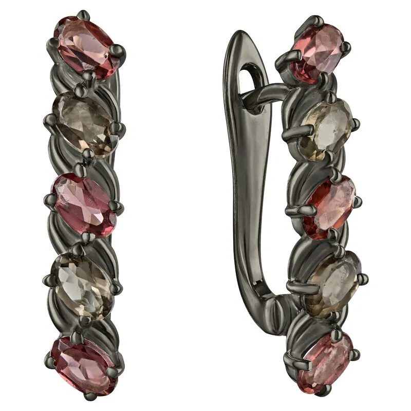 Серебряные серьги с натуральными камнями гранат и раухтопаз - коллекция Колосок, покрытие Черный Родий.