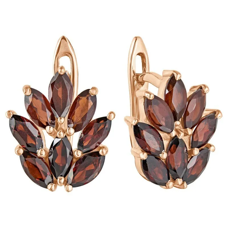 Серебряные серьги с натуральным гранатом - коллекция Искра. Серебряные серьги 925 пробы с покрытием красное золото. Цвет покрытия соответствует швейцарскому цветовому стандарту NIHS -5N и цвету красного золота 585 в России. На последней фотографии мы разместили сравнительную фотографию 3 цвета золотого покрытия. Помимо предания золотого цвета Вашему изделию, тонкий слой золота защищает от окисления. Для более стойкого эффекта золочения и долговечности покрытия мы дополнительно наносим подслой палладия (Pd). Средний вес изделия с камнями 4.13 гр. Месторождение: Гранат (Кольский п-ов, Россия) Гранат (Натуральный) маркиз 3*6 мм., средний вес: 0.33 карат. Все изделия собственного производства. Гарантия 12 месяцев.Арт. 8148. Гранат называют камнем любви. Он дарит своим обладательницам мудрость, а владельцам – решительность и храбрость. Данному камню присущи лечебные свойства, давным-давно он использовался при ранениях. Считалось, что он помогает поддерживать связь с миром мертвых.