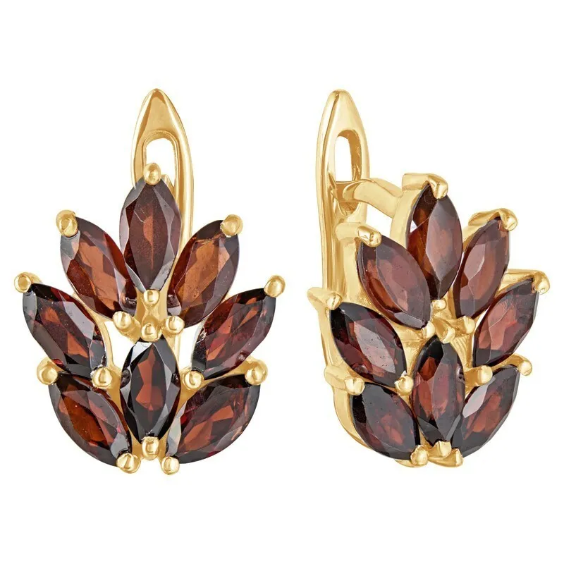 Серебряные серьги с натуральным гранатом - коллекция Искра. Серебряные серьги 925 пробы с покрытием желтое золото. Цвет покрытия соответствует швейцарскому цветовому стандарту NIHS -FF24ct и цвету чистого золото 999.99. На последней фотографии мы разместили сравнительную фотографию 3 цвета золотого покрытия. Помимо предания золотого цвета Вашему изделию, тонкий слой золота защищает от окисления. Для более стойкого эффекта золочения и долговечности покрытия мы дополнительно наносим подслой палладия (Pd). Средний вес изделия с камнями 4.13 гр. Месторождение: Гранат (Кольский п-ов, Россия) Гранат (Натуральный) маркиз 3*6 мм., средний вес: 0.33 карат. Все изделия собственного производства. Гарантия 12 месяцев.Арт. 8148. Гранат называют камнем любви. Он дарит своим обладательницам мудрость, а владельцам – решительность и храбрость. Данному камню присущи лечебные свойства, давным-давно он использовался при ранениях. Считалось, что он помогает поддерживать связь с миром мертвых.
