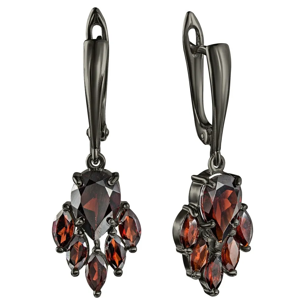 Серебряные серьги с натуральным гранатом - коллекция Зарница, покрытие Черный Родий.