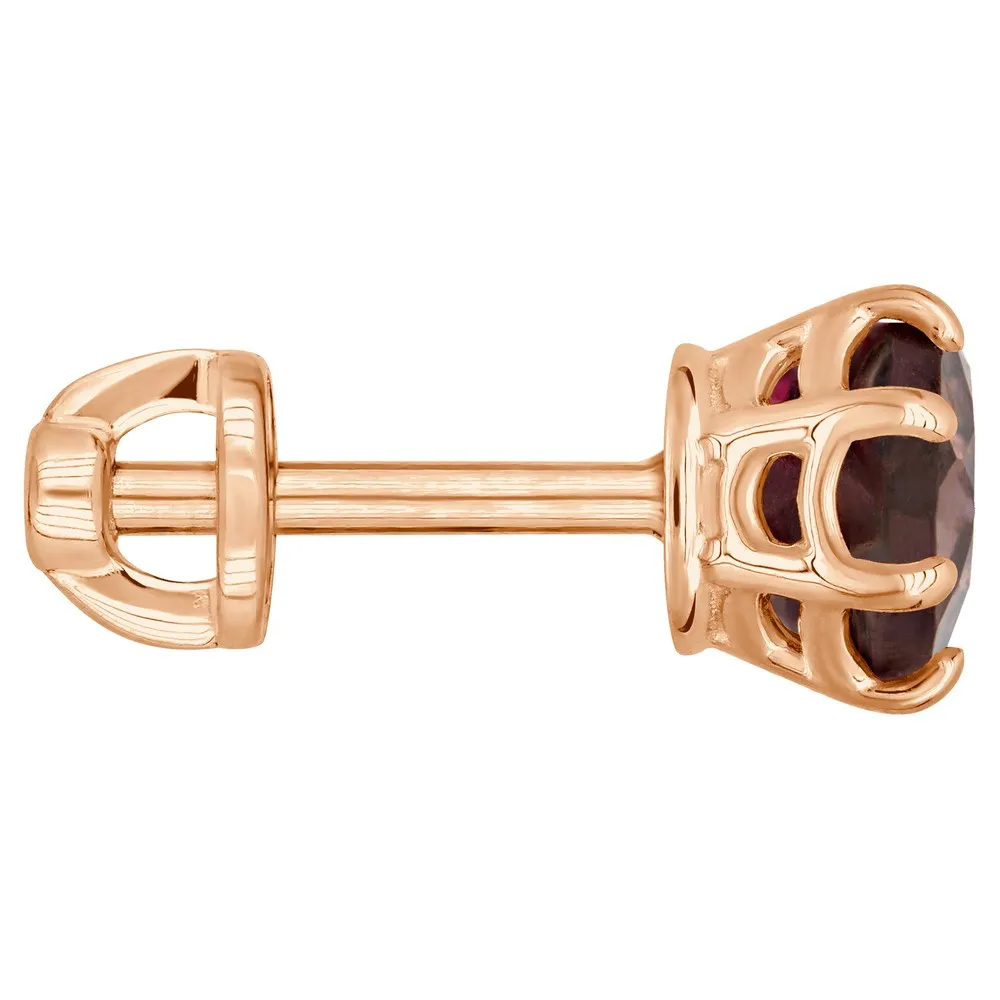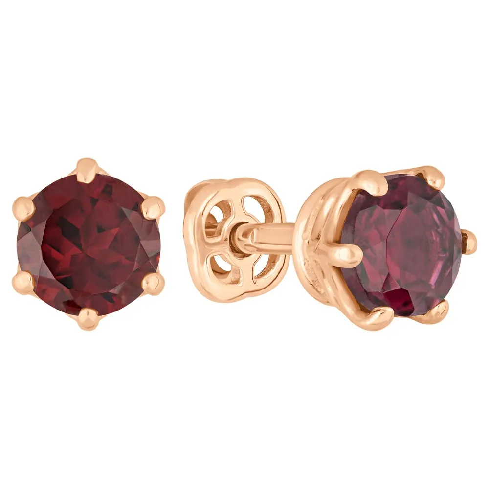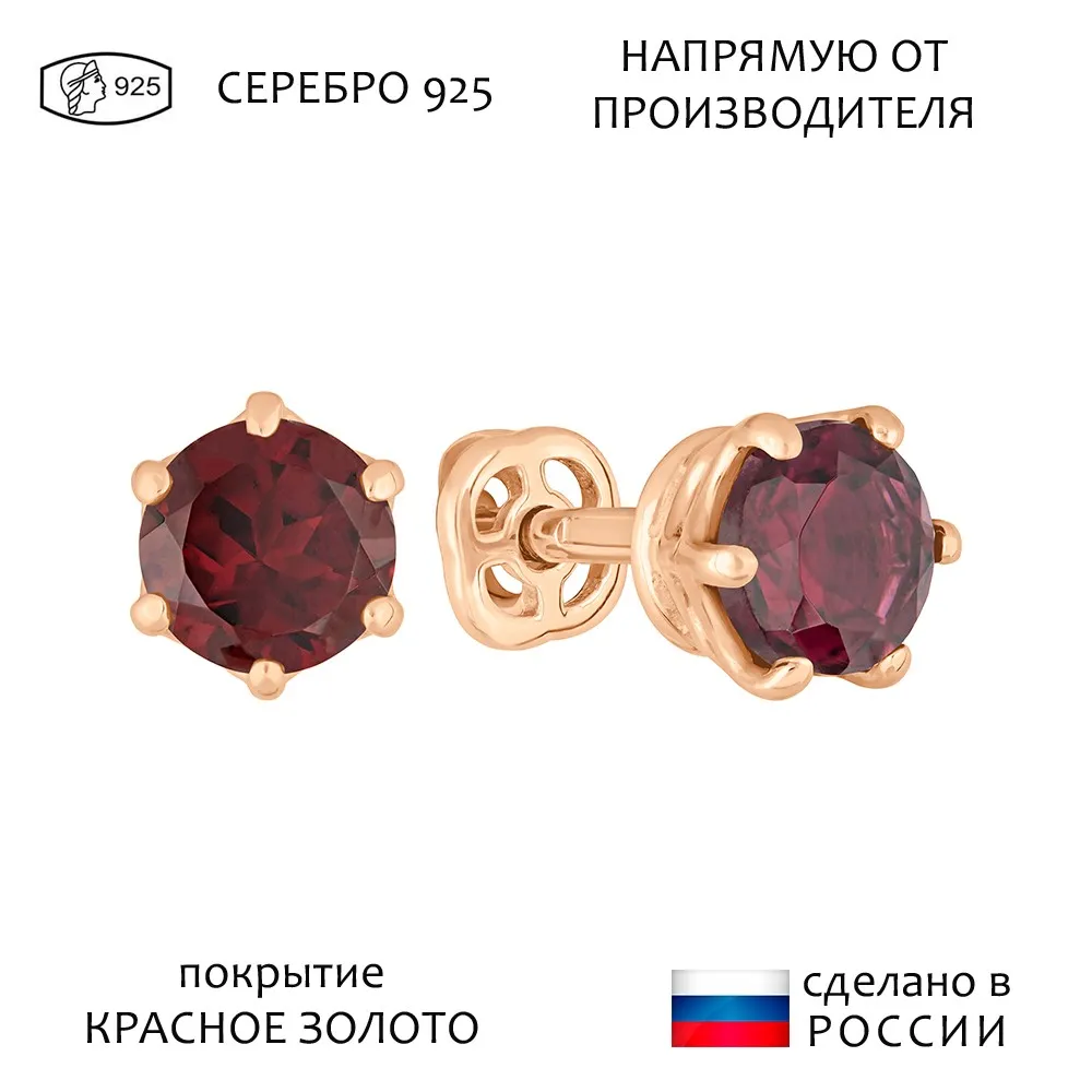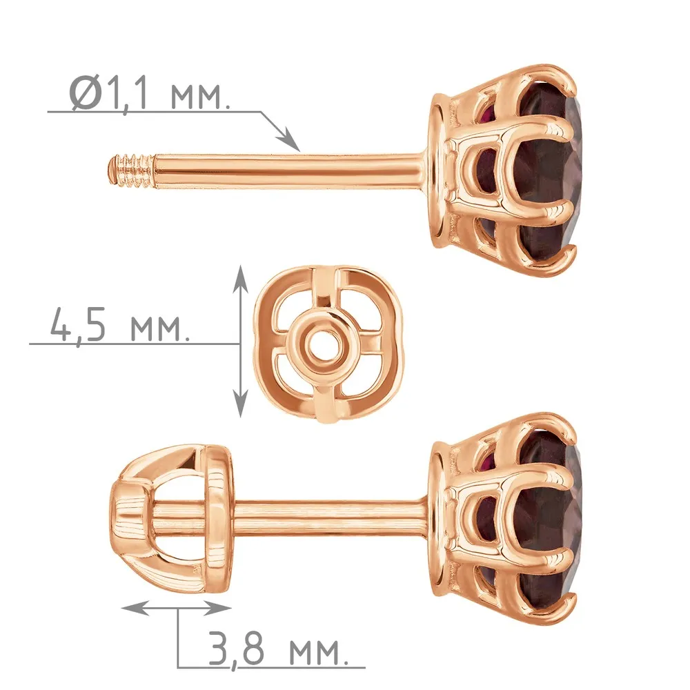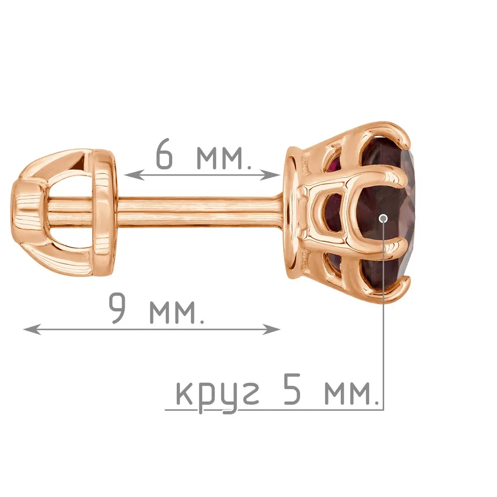 Серебряные серьги гвоздики (пусеты) с натуральным гранатом 5 мм. / Красное золото.