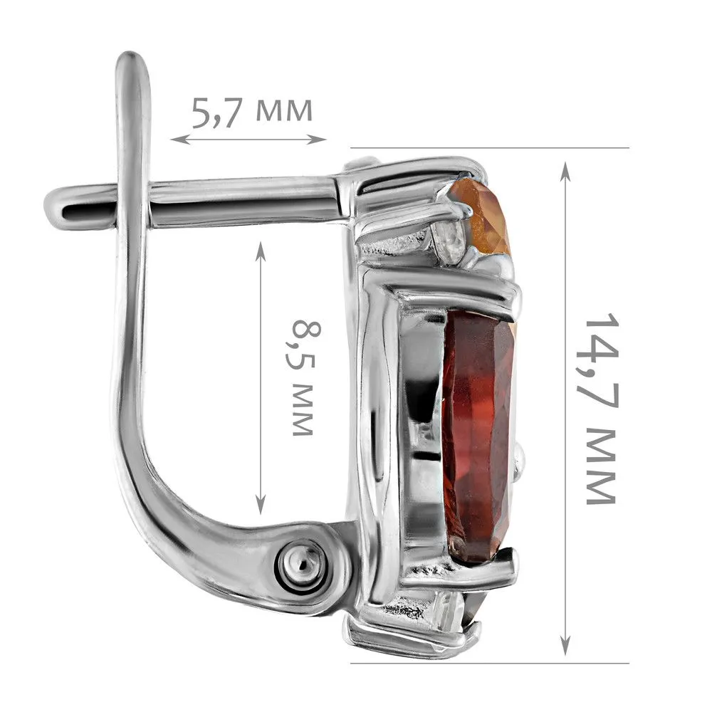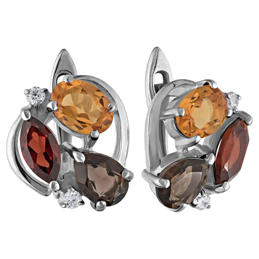Серебряные серьги Фортуна с натуральными камнями цитрин, раухтопаз и гранат, покрытие Палладий. Средний вес украшения с камнями 5,64 гр. Месторождение(я) камней: Цитрин (Урал, Россия), Раухтопаз (Дымчатый кварц) (м-ние Додо ХМАО, Россия), Гранат (Кольский п-ов, Россия). Гранат (Натуральный) маркиз: 4*8 мм., средний вес 0,75 карат. Цитрин (Натуральный) овал: 5*7 мм., средний вес 0,80 карат. Раухтопаз (Натуральный) груша: 5*7 мм., средний вес 0,70 карат. Циркон белый (Натуральный) круг: 2 мм., средний вес 0,05 карат. Размер лицевой части: 13*14 мм. Все изделия собственного производства и имеют гарантию 12 месяцев. Арт. 6680PD . Цитрин – камень, который активно использовался для инкрустации. С его помощью излечивали заболевания желудочно-кишечного тракта, он становился амулетом, приносящим удачу. Золотисто-жёлтый камень известен и любим очень давно за ряд своих положительных качеств.