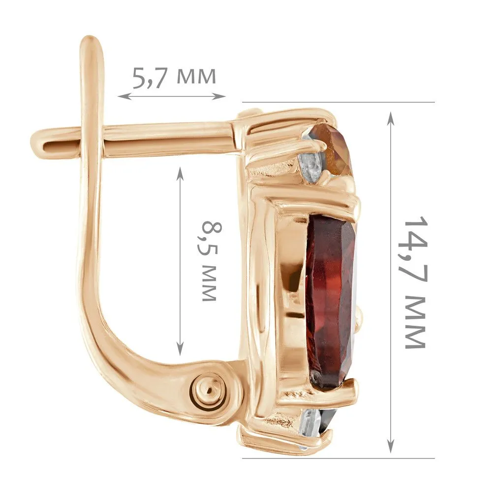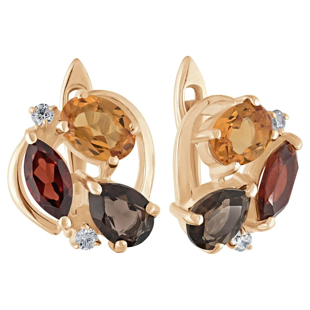 Серебряные серьги Фортуна с натуральными камнями цитрин, раухтопаз и гранат, покрытие Розовое Золото. Средний вес украшения с камнями 5,64 гр. Месторождение(я) камней: Цитрин (Урал, Россия), Раухтопаз (Дымчатый кварц) (м-ние Додо ХМАО, Россия), Гранат (Кольский п-ов, Россия). Гранат (Натуральный) маркиз: 4*8 мм., средний вес 0,75 карат. Цитрин (Натуральный) овал: 5*7 мм., средний вес 0,80 карат. Раухтопаз (Натуральный) груша: 5*7 мм., средний вес 0,70 карат. Циркон белый (Натуральный) круг: 2 мм., средний вес 0,05 карат. Размер лицевой части: 13*14 мм. Все изделия собственного производства и имеют гарантию 12 месяцев. Арт. 6680PG . Цитрин – камень, который активно использовался для инкрустации. С его помощью излечивали заболевания желудочно-кишечного тракта, он становился амулетом, приносящим удачу. Золотисто-жёлтый камень известен и любим очень давно за ряд своих положительных качеств.