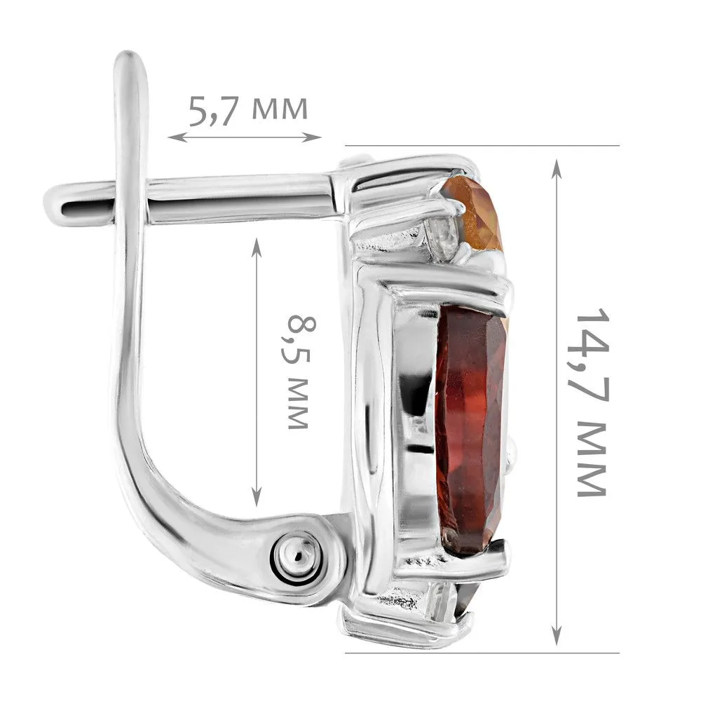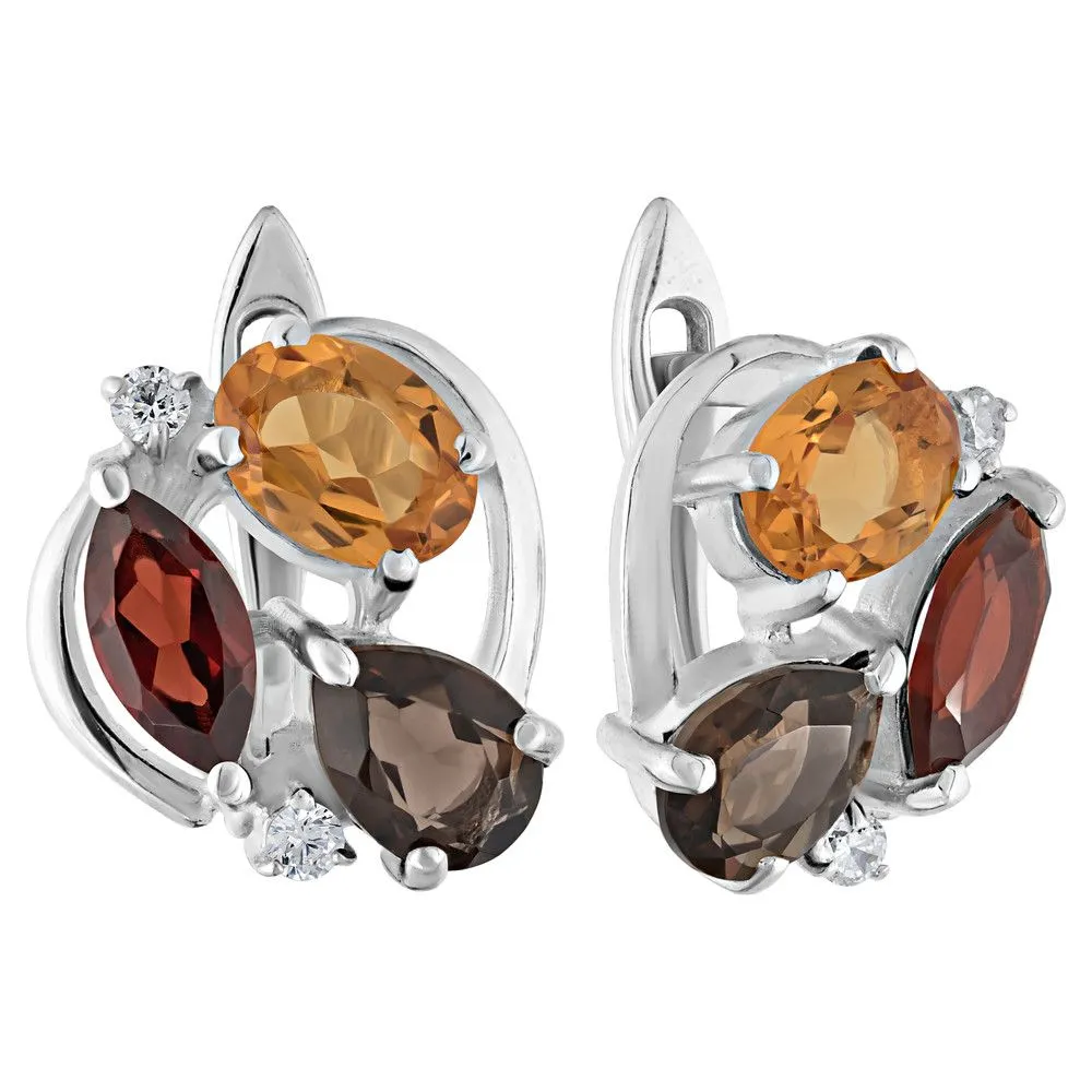 Серебряные серьги Фортуна с натуральными камнями цитрин, раухтопаз и гранат, покрытие Белый Родий. Средний вес украшения с камнями 5,64 гр. Месторождение(я) камней: Цитрин (Урал, Россия), Раухтопаз (Дымчатый кварц) (м-ние Додо ХМАО, Россия), Гранат (Кольский п-ов, Россия). Гранат (Натуральный) маркиз: 4*8 мм., средний вес 0,75 карат. Цитрин (Натуральный) овал: 5*7 мм., средний вес 0,80 карат. Раухтопаз (Натуральный) груша: 5*7 мм., средний вес 0,70 карат. Циркон белый (Натуральный) круг: 2 мм., средний вес 0,05 карат. Размер лицевой части: 13*14 мм. Все изделия собственного производства и имеют гарантию 12 месяцев. Арт. 6680WR . Цитрин – камень, который активно использовался для инкрустации. С его помощью излечивали заболевания желудочно-кишечного тракта, он становился амулетом, приносящим удачу. Золотисто-жёлтый камень известен и любим очень давно за ряд своих положительных качеств.