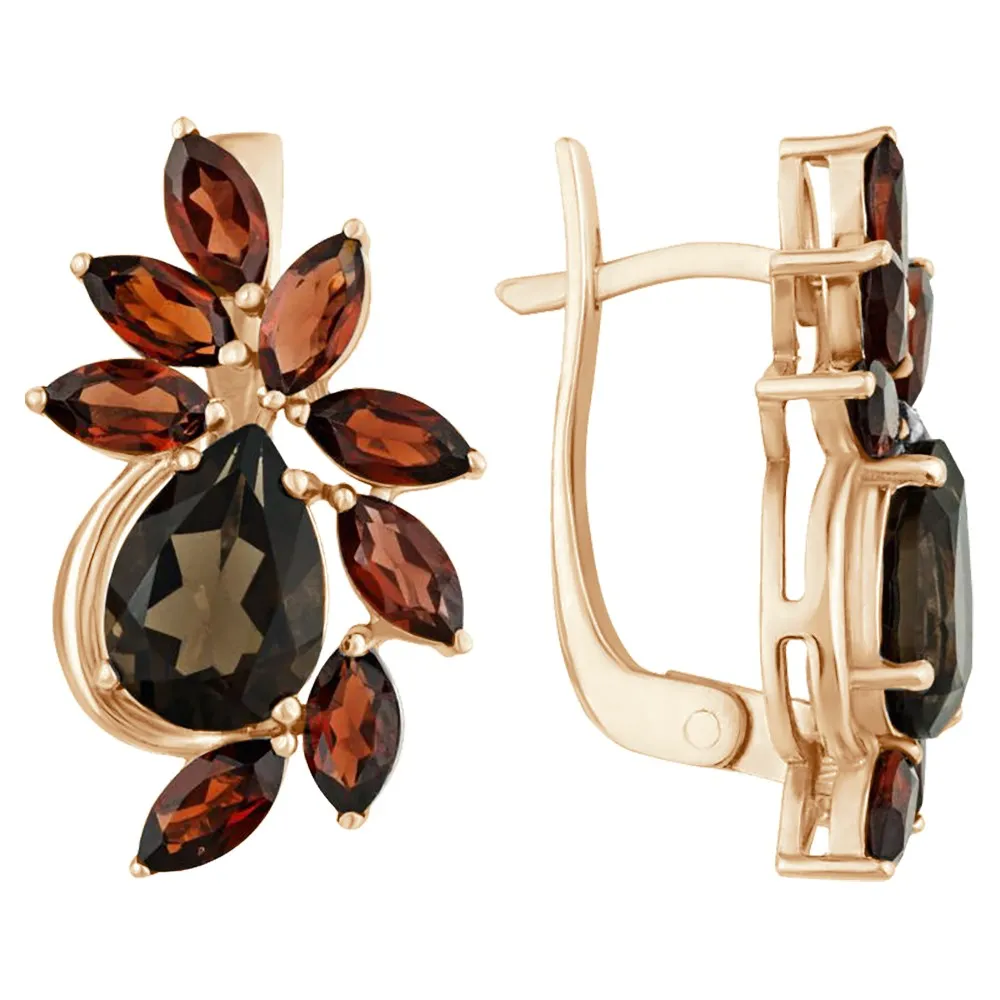 Современные серебряные серьги "Элегия", с натуральными камнями раухтопаз (дымчатый кварц) и гранат, покрытие Розовое Золото. Средний вес украшения с камнями: 7,21 гр. Натуральные камни: Раухтопаз (Дымчатый кварц)(м-ние Додо ХМАО, Россия), Гранат (Кольский п-ов, Россия). Раухтопаз (Натуральный) груша: 7*10 мм., средний вес 1,85 карат. Гранат (Натуральный) маркиз: 3*6 мм. средний вес 0,35 карат. Размер лицевой части: 15*24 мм. Все изделия собственного производства и имеют гарантию 12 месяцев, к каждому изделию прилагается паспорт. Арт. 6255PG