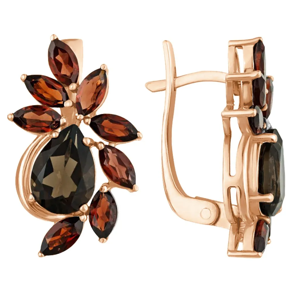 Современные серебряные серьги "Элегия", с натуральными камнями раухтопаз (дымчатый кварц) и гранат, покрытие Красное Золото. Средний вес украшения с камнями: 7,21 гр. Натуральные камни: Раухтопаз (Дымчатый кварц)(м-ние Додо ХМАО, Россия), Гранат (Кольский п-ов, Россия). Раухтопаз (Натуральный) груша: 7*10 мм., средний вес 1,85 карат. Гранат (Натуральный) маркиз: 3*6 мм. средний вес 0,35 карат. Размер лицевой части: 15*24 мм. Все изделия собственного производства и имеют гарантию 12 месяцев, к каждому изделию прилагается паспорт. Арт. 6255RG
