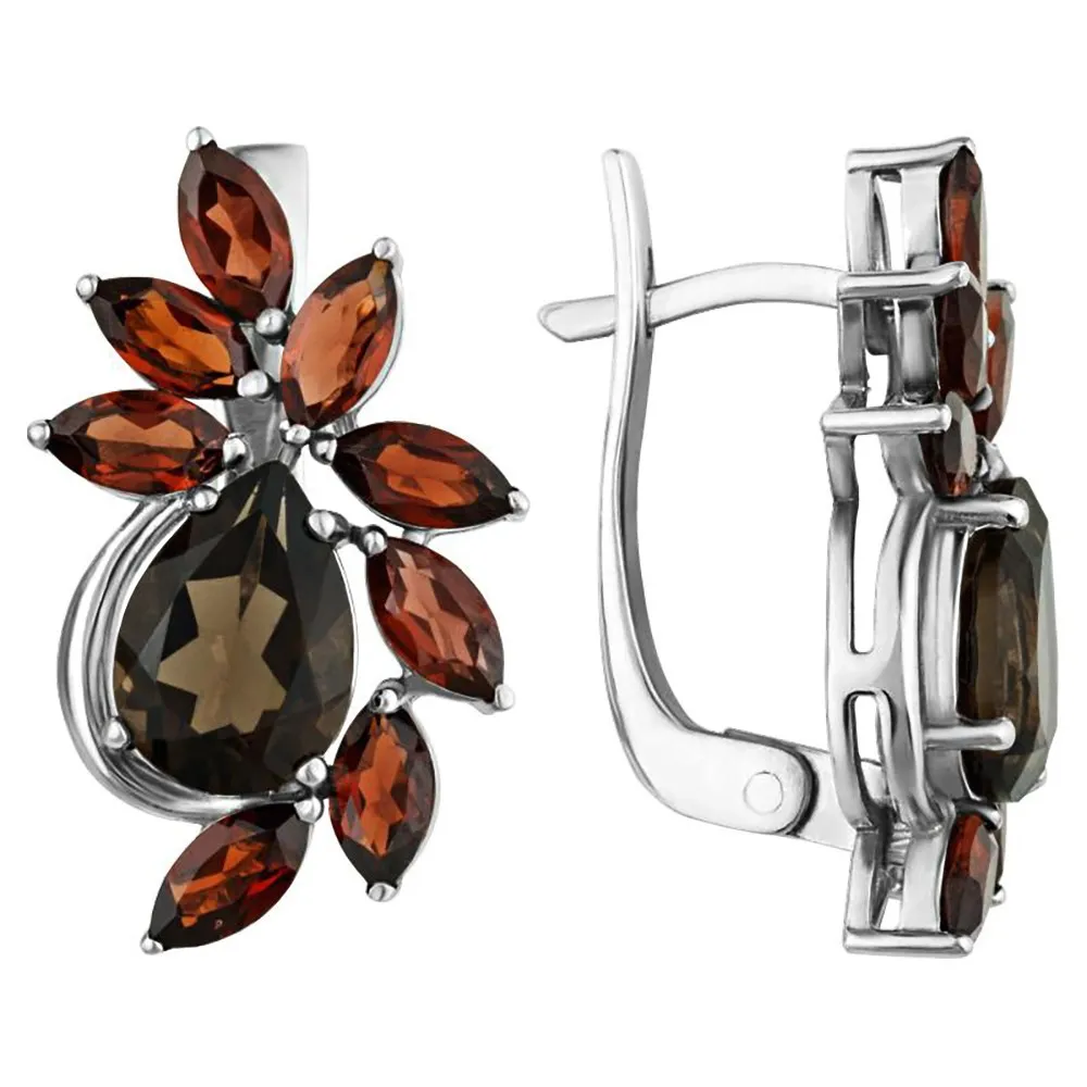 Современные серебряные серьги "Элегия", с натуральными камнями раухтопаз (дымчатый кварц) и гранат, покрытие Белый Родий. Средний вес украшения с камнями: 7,21 гр. Натуральные камни: Раухтопаз (Дымчатый кварц)(м-ние Додо ХМАО, Россия), Гранат (Кольский п-ов, Россия). Раухтопаз (Натуральный) груша: 7*10 мм., средний вес 1,85 карат. Гранат (Натуральный) маркиз: 3*6 мм. средний вес 0,35 карат. Размер лицевой части: 15*24 мм. Все изделия собственного производства и имеют гарантию 12 месяцев, к каждому изделию прилагается паспорт. Арт. 6255WR