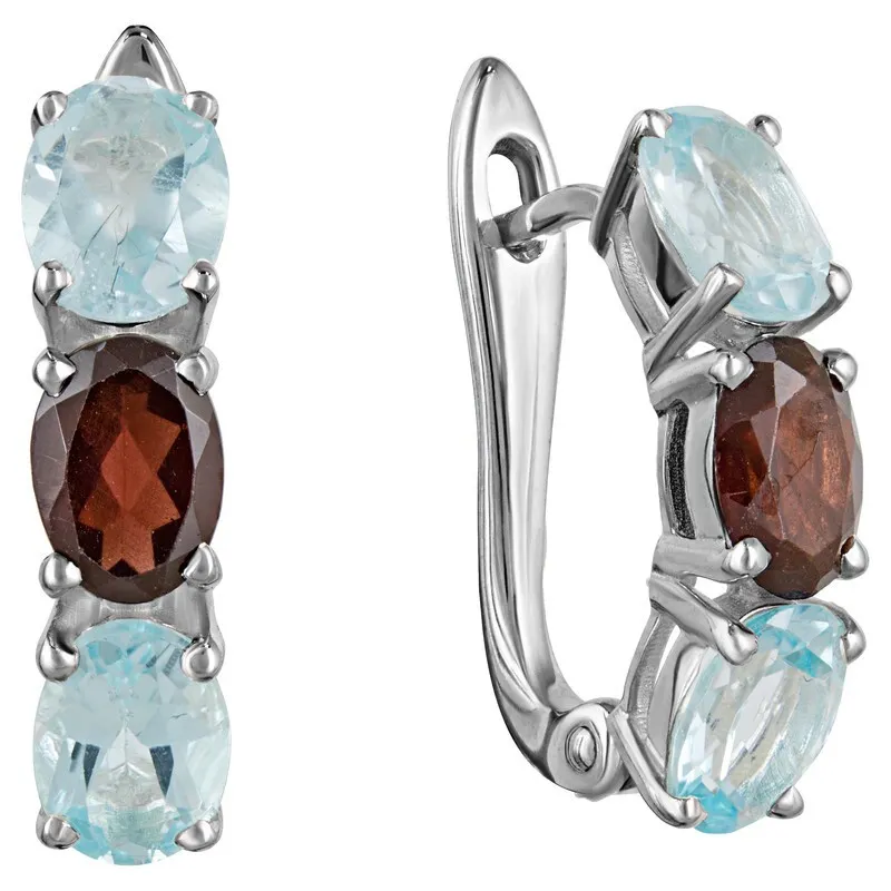 Серебряные серьги с натуральными камнями гранат и топаз - коллекция Муза. Средний вес изделия с камнями 4.95гр. Месторождение(я): Гранат (Кольский п-ов, Россия) и Голубой топаз (Ильменские горы, Россия). Гранат (Натуральный) овал 5*7 мм., средний вес: 1.06 карат. Топаз (Натуральный) овал 5*7 мм., средний вес: 0.89 карат. Все изделия собственного производства. Гарантия 12 месяцев.Арт. 8007. Гранат называют камнем любви. Он дарит своим обладательницам мудрость, а владельцам – решительность и храбрость. Данному камню присущи лечебные свойства, давным-давно он использовался при ранениях. Считалось, что он помогает поддерживать связь с миром мертвых.
