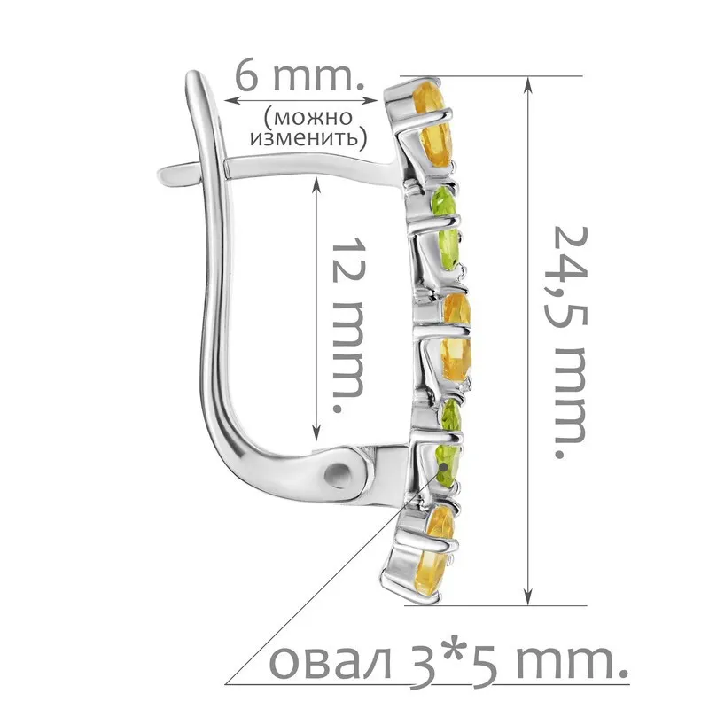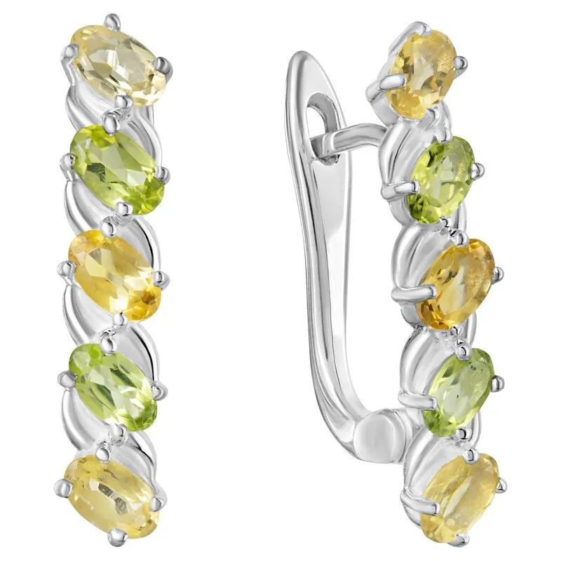 Серебряные серьги с натуральными камнями цитрин и хризолит - коллекция Колосок. Средний вес изделия с камнями 4.19 гр. Месторождения: Цитрин (Урал, Россия) и Хризолит (Якутия, Россия) Цитрин (Натуральный) овал 3*5 мм., средний вес: 0.24 карат. Хризолит (Натуральный) овал 3*5 мм., средний вес: 0.25 карат. Все изделия собственного производства. Гарантия 12 месяцев.Арт. 8030. Хризолит – камень, который называют «вечерним изумрудом» за удивительную способность менять цвет в зависимости от освещения. Считается, что хризолит очень любила Клеопатра. Хризолитовый порошок используется для общего восстановления организма, для очищения пищи от ядов и токсинов и улучшения работы ЖКТ. Кроме того, минерал защищает от опасностей и укрепляет дружеские отношения.
