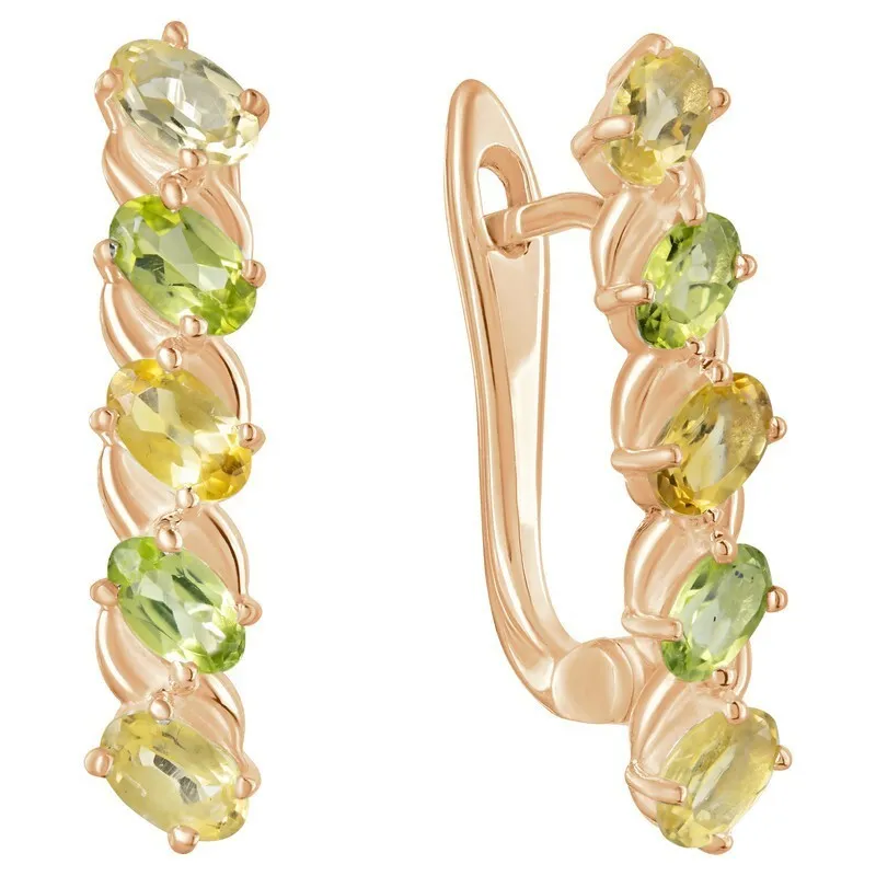 Серебряные серьги с натуральными камнями цитрин и хризолит - коллекция Колосок. Серебряные серьги 925 пробы с покрытием розовое золото. Цвет покрытия соответствует швейцарскому цветовому стандарту NIHS -4N и цвету розового золота 585 в России. На последней фотографии мы разместили сравнительную фотографию 3 цвета золотого покрытия. Помимо предания золотого цвета Вашему изделию, тонкий слой золота защищает от окисления. Для более стойкого эффекта золочения и долговечности покрытия мы дополнительно наносим подслой палладия (Pd). Средний вес изделия с камнями 4.19 гр. Месторождения: Цитрин (Урал, Россия) и Хризолит (Якутия, Россия) Цитрин (Натуральный) овал 3*5 мм., средний вес: 0.24 карат. Хризолит (Натуральный) овал 3*5 мм., средний вес: 0.25 карат. Все изделия собственного производства. Гарантия 12 месяцев.Арт. 8030. Хризолит – камень, который называют «вечерним изумрудом» за удивительную способность менять цвет в зависимости от освещения. Считается, что хризолит очень любила Клеопатра. Хризолитовый порошок используется для общего восстановления организма, для очищения пищи от ядов и токсинов и улучшения работы ЖКТ. Кроме того, минерал защищает от опасностей и укрепляет дружеские отношения.