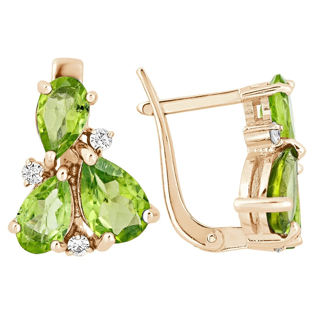 Серебряные серьги "Капель" с натуральным хризолитом, покрытие Розовое Золото. Средний вес украшения с камнями 5,62 гр. Месторождение(я) камней: Хризолит (Якутия, Россия) . Хризолит (Натуральный) груша: 6*9 мм., средний вес 1,00 карат. Хризолит (Натуральный) груша: 5*7 мм., средний вес 0,75 карат. Циркон белый (Натуральный) круг: 2 мм., средний вес 0,05 карат.