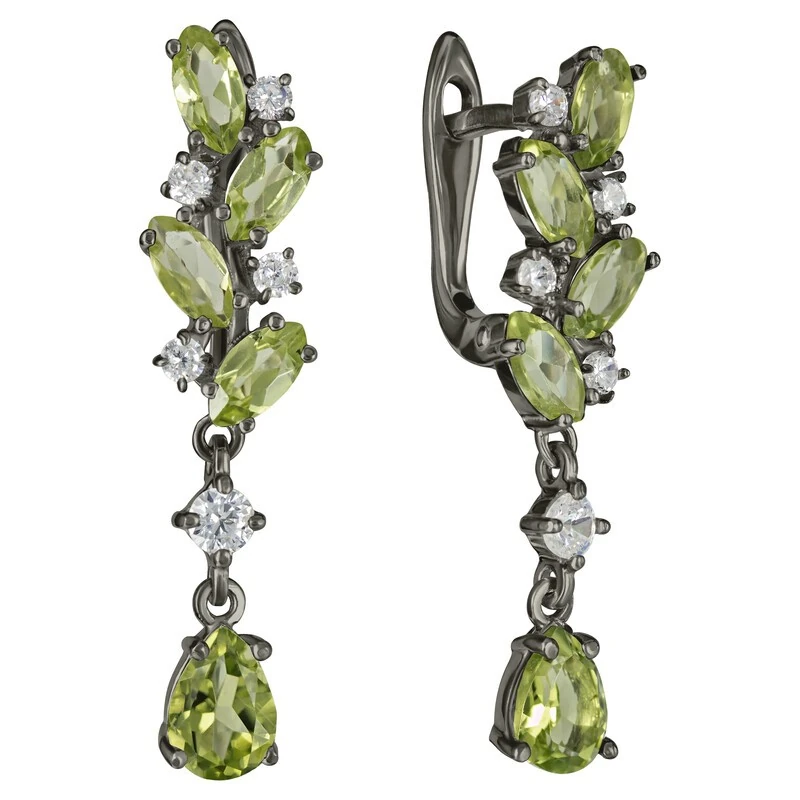 Серебряные серьги с натуральным хризолитом - коллекция Росинка, покрытие Черный Родий.