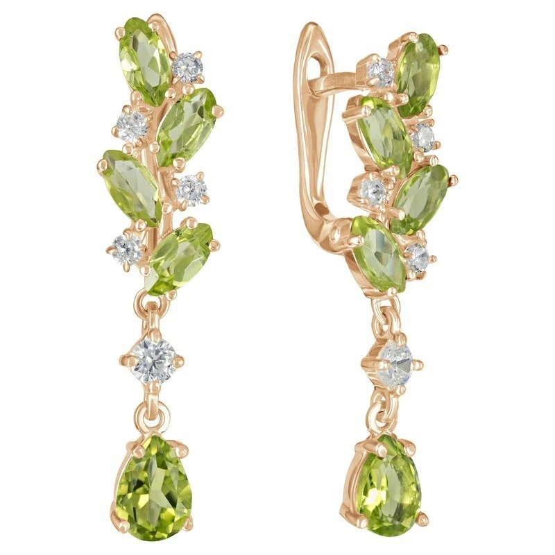 Серебряные серьги с натуральным хризолитом - коллекция Росинка. Серебряные серьги 925 пробы с покрытием розовое золото. Цвет покрытия соответствует швейцарскому цветовому стандарту NIHS -4N и цвету розового золота 585 в России. На последней фотографии мы разместили сравнительную фотографию 3 цвета золотого покрытия. Помимо предания золотого цвета Вашему изделию, тонкий слой золота защищает от окисления. Для более стойкого эффекта золочения и долговечности покрытия мы дополнительно наносим подслой палладия (Pd). Средний вес изделия с камнями 4.46 гр. Месторождение: Хризолит (Якутия, Россия). Хризолит (Натуральный) груша 5*7 мм., средний вес: 0.55 карат. Все изделия собственного производства. Гарантия 12 месяцев.Арт. 8427. Хризолит – камень, который называют «вечерним изумрудом» за удивительную способность менять цвет в зависимости от освещения. Считается, что хризолит очень любила Клеопатра. Хризолитовый порошок используется для общего восстановления организма, для очищения пищи от ядов и токсинов и улучшения работы ЖКТ. Кроме того, минерал защищает от опасностей и укрепляет дружеские отношения.