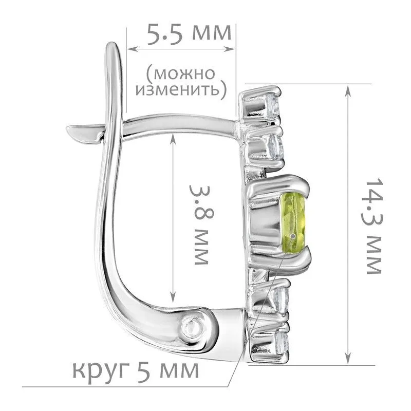 Серебряные серьги с натуральным хризолитом - коллекция Нова / Без покрытия.Средний вес украшения с камнями 2.54 гр.Месторождение(я): Хризолит (Якутия, Россия).Ювелирные вставки:Хризолит (Натуральный) круг 5 мм., средний вес: 0.56 карат.Белый Нанокристалл круг 2 мм., средний вес: 0.06 карат.Все изделия собственного производства и имеют гарантию 12 месяцев. Арт. 8712NP . Хризолит – камень, который называют «вечерним изумрудом» за удивительную способность менять цвет в зависимости от освещения. Считается, что хризолит очень любила Клеопатра. Хризолитовый порошок используется для общего восстановления организма, для очищения пищи от ядов и токсинов и улучшения работы ЖКТ. Кроме того, минерал защищает от опасностей и укрепляет дружеские отношения.