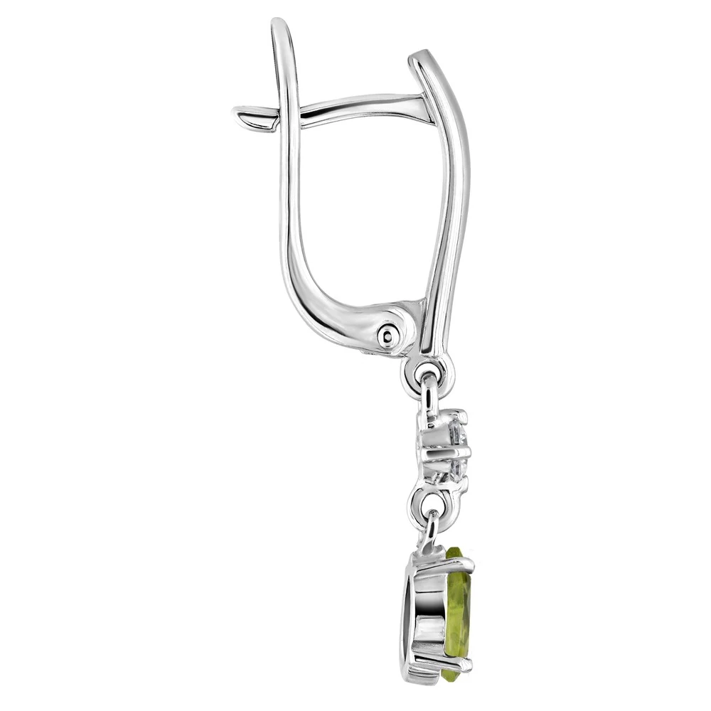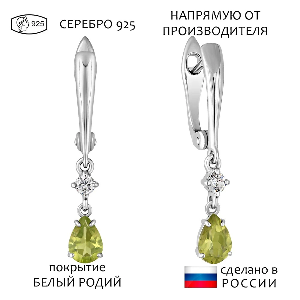 Серебряные серьги с натуральным хризолитом - коллекция Алсу (малая) / Белый Родий.