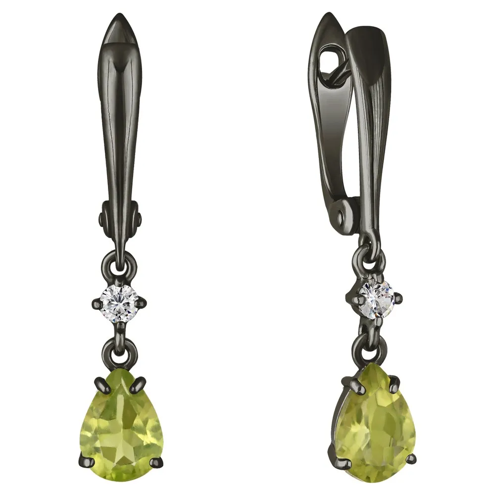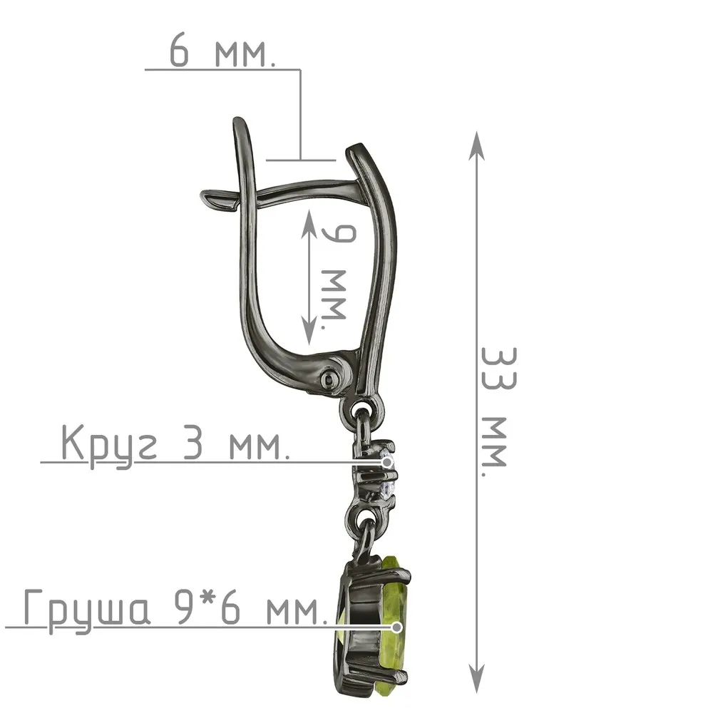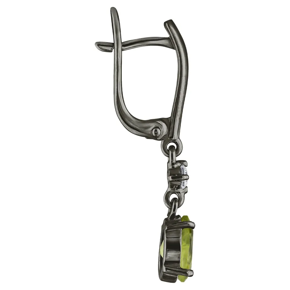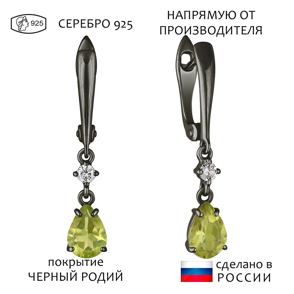 Серебряные серьги с натуральным хризолитом - коллекция Алсу (большая) / Черный Родий.