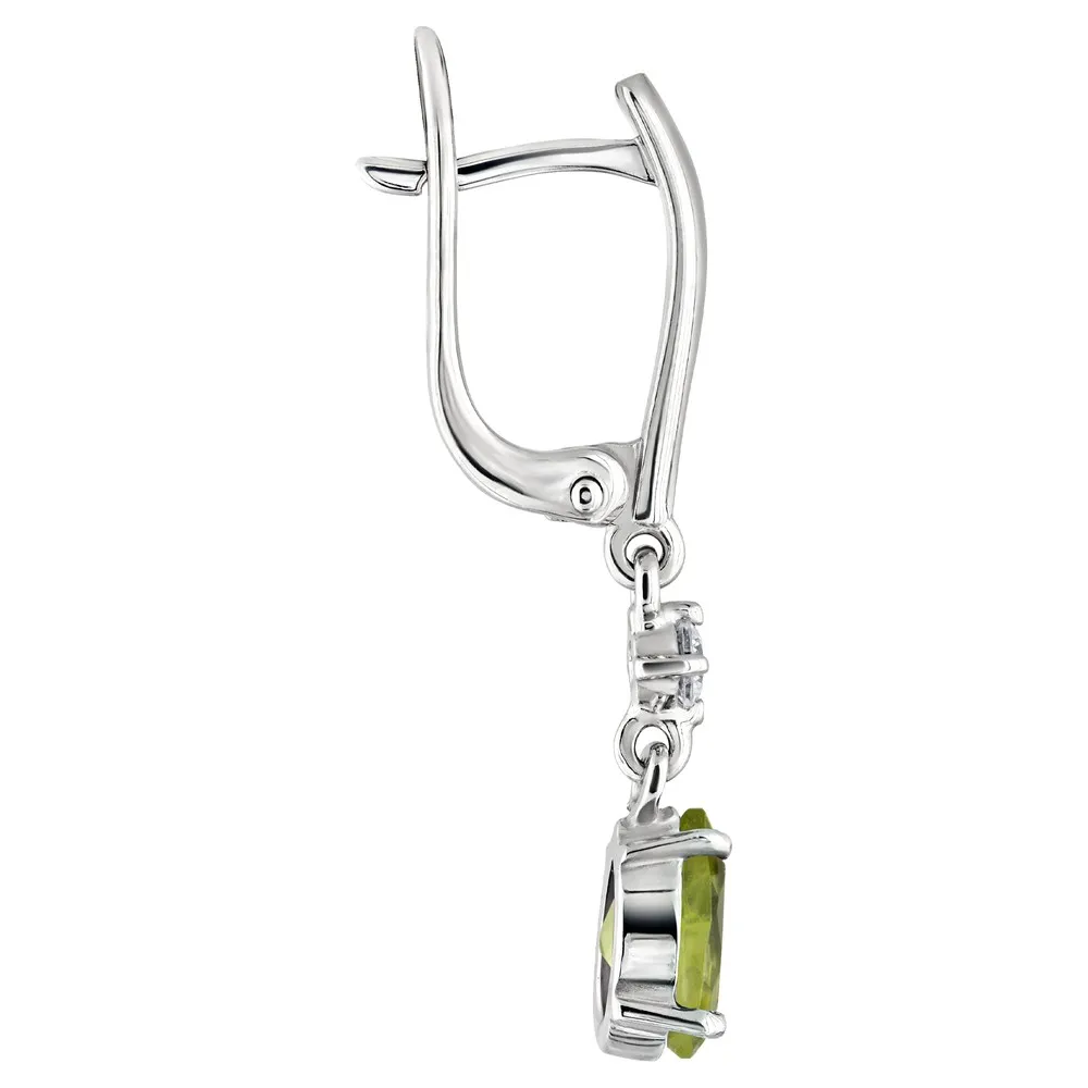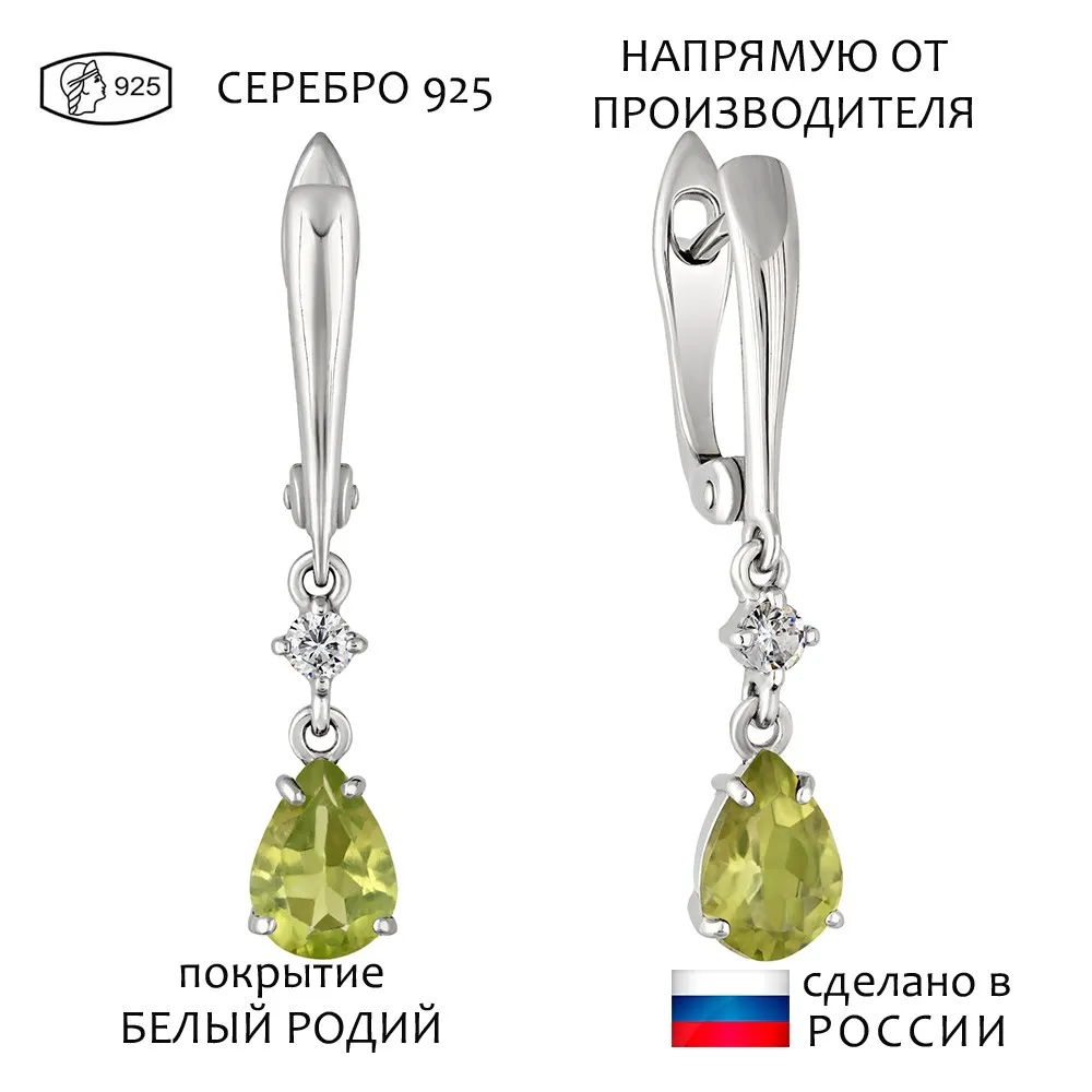 Серебряные серьги с натуральным хризолитом - коллекция Алсу (большая) / Белый Родий.