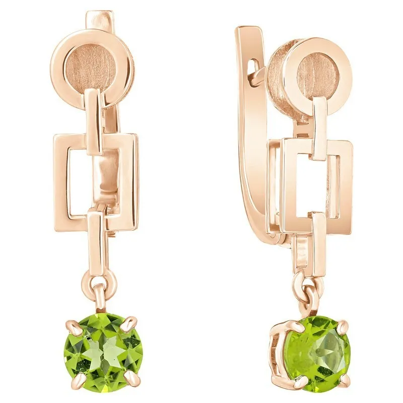 Серебряные серьги с натуральным хризолитом - коллекция Классик / покрытие Красное Золото