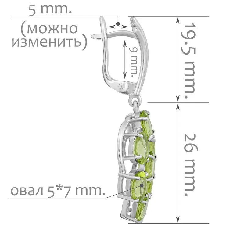 Серебряные серьги с натуральным хризолитом - коллекция Аэлита. Средний вес изделия с камнями 9.79 гр. Месторождение: Хризолит (Якутия, Россия). Хризолит (Натуральный) овал 5*7 мм., средний вес: 0.85 карат. Все изделия собственного производства. Гарантия 12 месяцев.Арт. 7823. Хризолит – камень, который называют «вечерним изумрудом» за удивительную способность менять цвет в зависимости от освещения. Считается, что хризолит очень любила Клеопатра. Хризолитовый порошок используется для общего восстановления организма, для очищения пищи от ядов и токсинов и улучшения работы ЖКТ. Кроме того, минерал защищает от опасностей и укрепляет дружеские отношения.