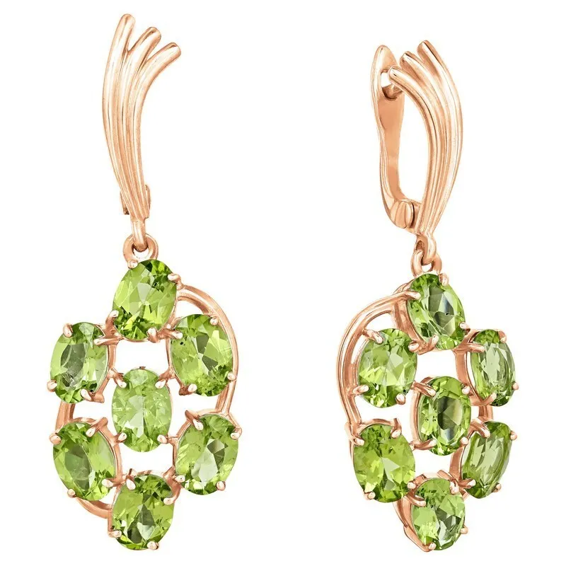 Серебряные серьги с натуральным хризолитом - коллекция Аэлита. Серебряные серьги 925 пробы с покрытием красное золото. Цвет покрытия соответствует швейцарскому цветовому стандарту NIHS -5N и цвету красного золота 585 в России. На последней фотографии мы разместили сравнительную фотографию 3 цвета золотого покрытия. Помимо предания золотого цвета Вашему изделию, тонкий слой золота защищает от окисления. Для более стойкого эффекта золочения и долговечности покрытия мы дополнительно наносим подслой палладия (Pd). Средний вес изделия с камнями 9.79 гр. Месторождение: Хризолит (Якутия, Россия). Хризолит (Натуральный) овал 5*7 мм., средний вес: 0.85 карат. Все изделия собственного производства. Гарантия 12 месяцев.Арт. 7823. Хризолит – камень, который называют «вечерним изумрудом» за удивительную способность менять цвет в зависимости от освещения. Считается, что хризолит очень любила Клеопатра. Хризолитовый порошок используется для общего восстановления организма, для очищения пищи от ядов и токсинов и улучшения работы ЖКТ. Кроме того, минерал защищает от опасностей и укрепляет дружеские отношения.