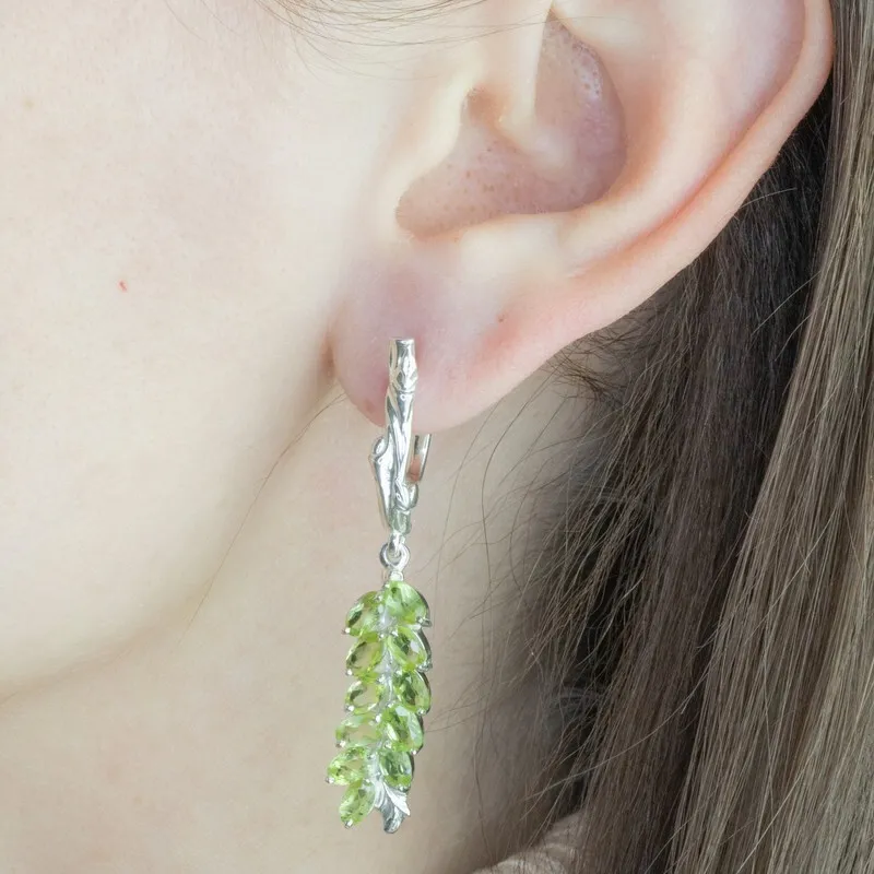 Серебряные серьги с натуральным хризолитом - коллекция Флора / покрытие Белый Родий