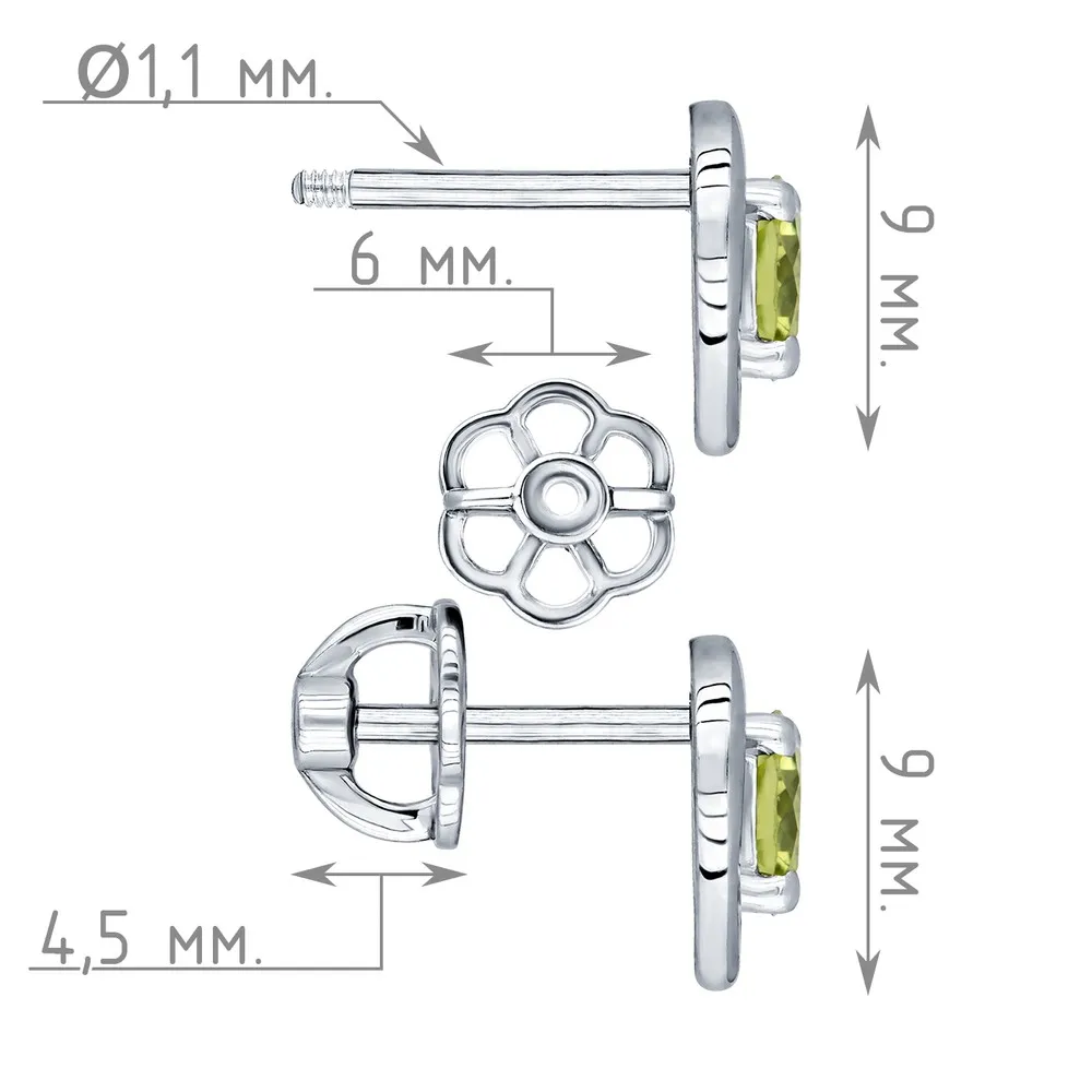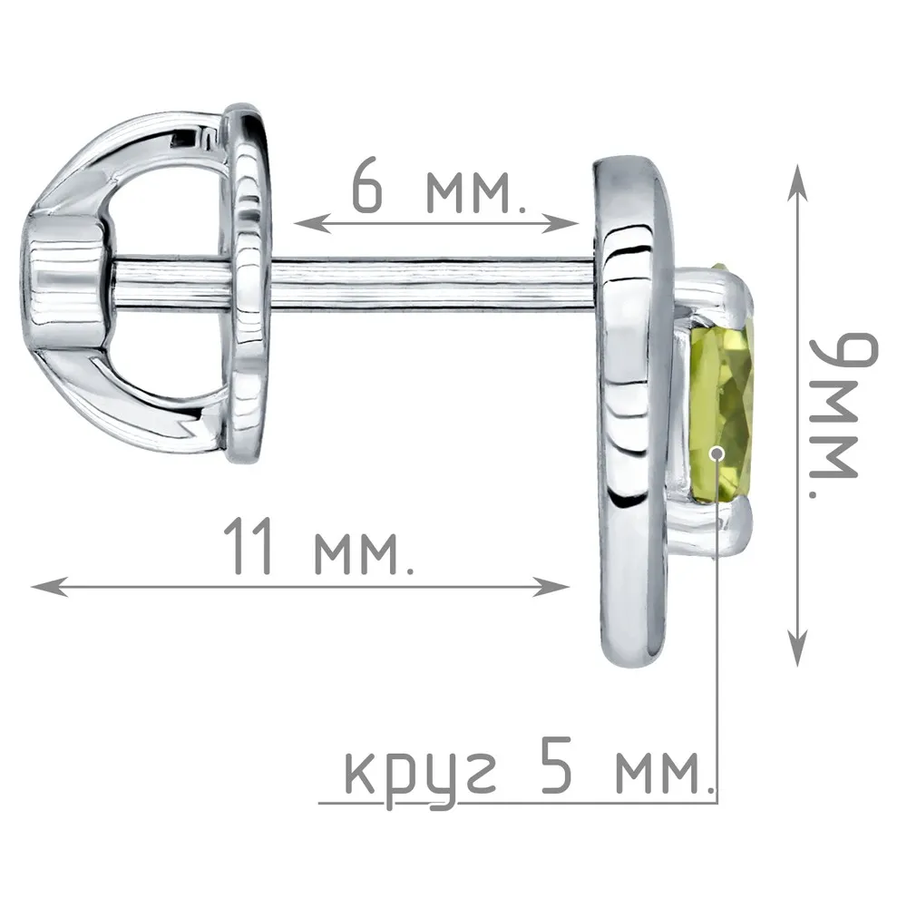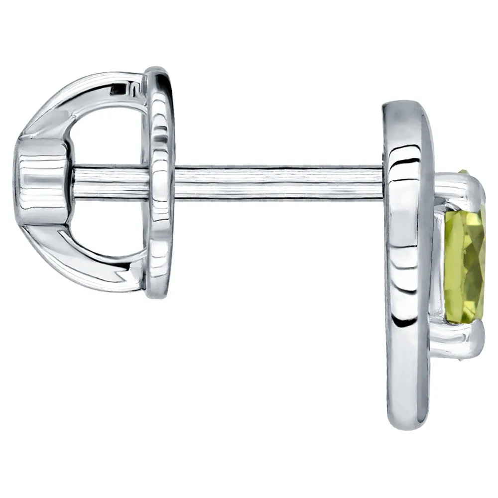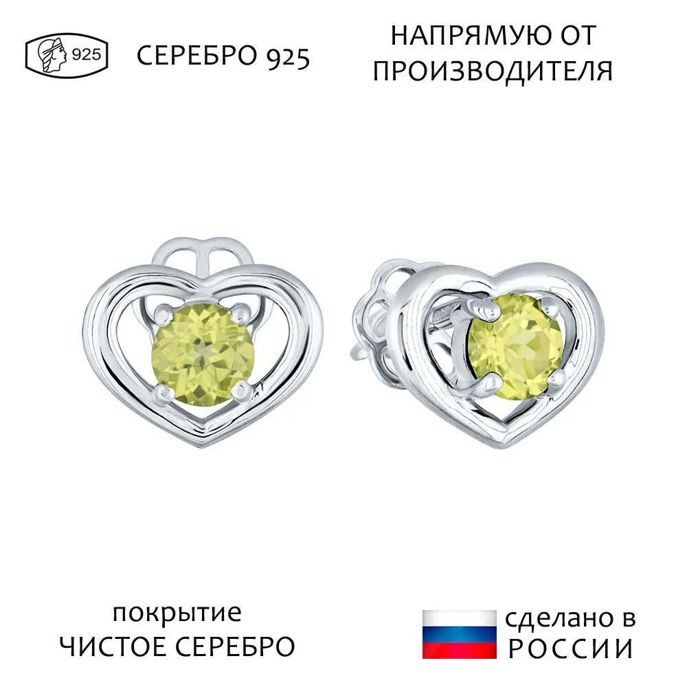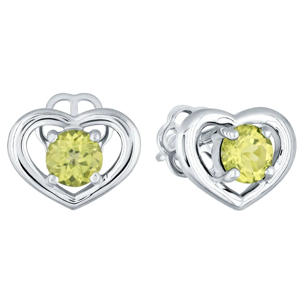 Серебряные серьги гвоздики (пусеты) с натуральным хризолитом - Сердце / покрытие Чистое Серебро.