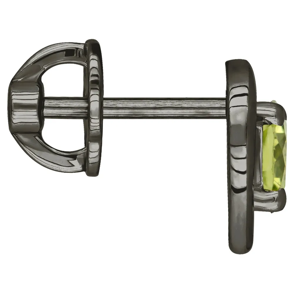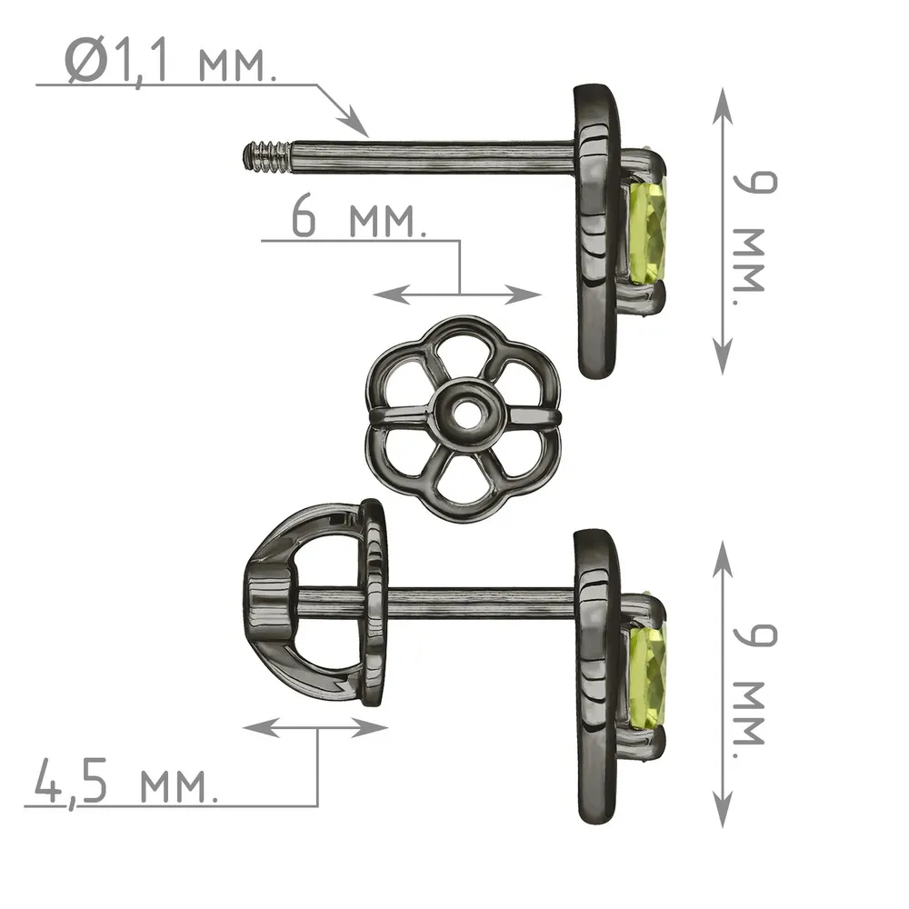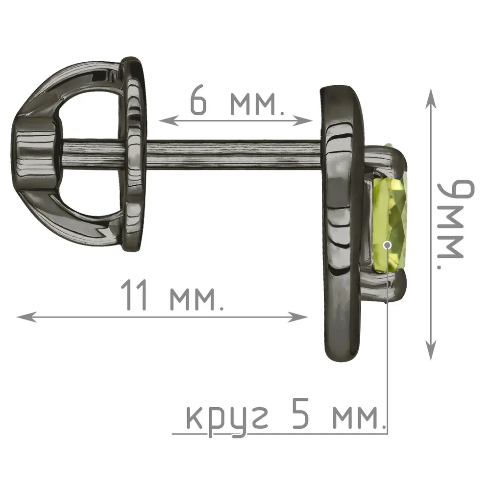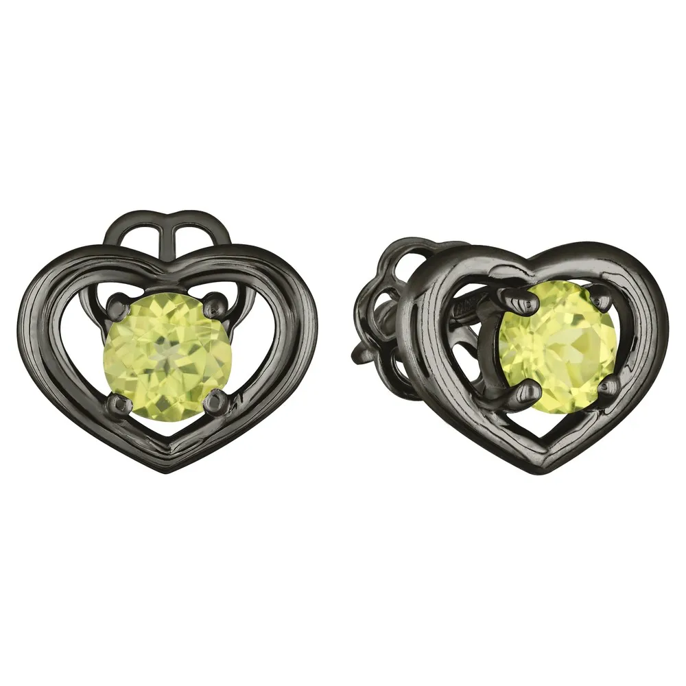 Серебряные серьги гвоздики (пусеты) с натуральным хризолитом - Сердце / покрытие Черный Родий.
