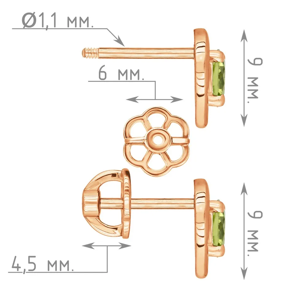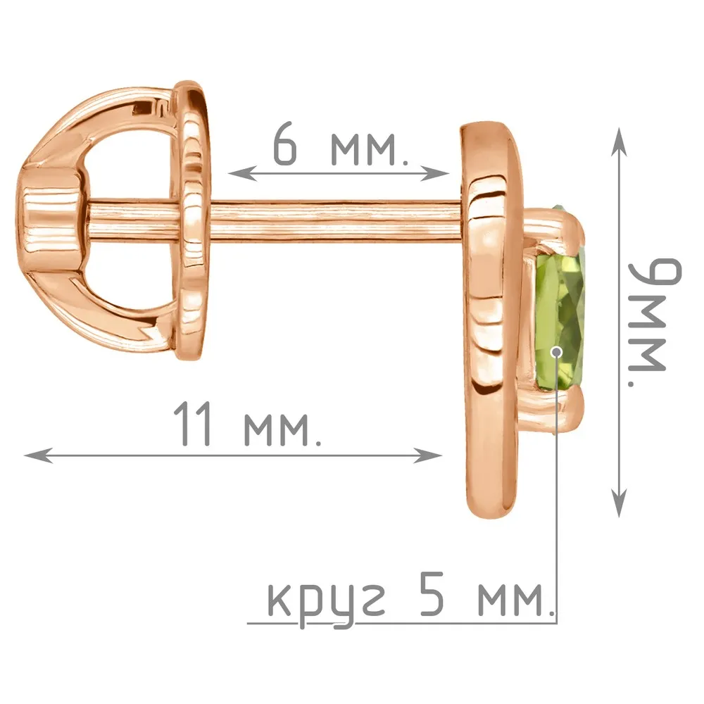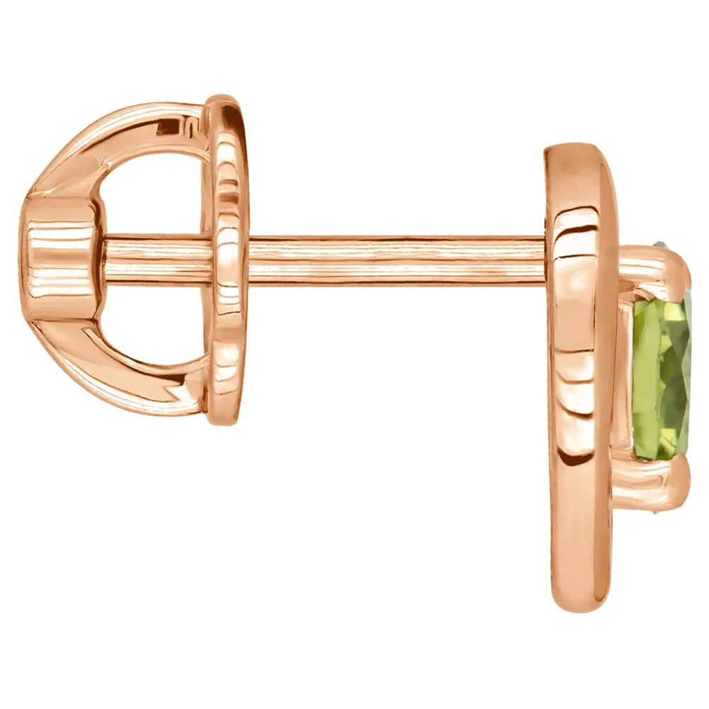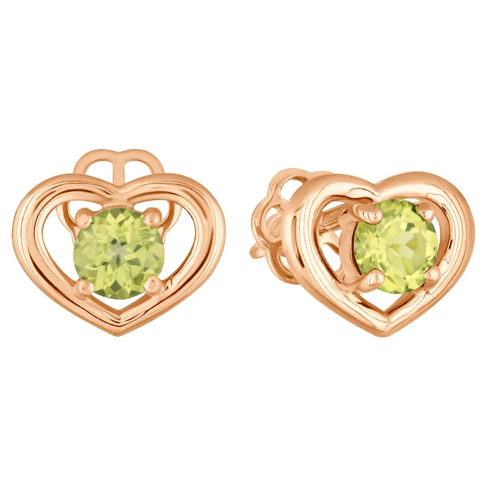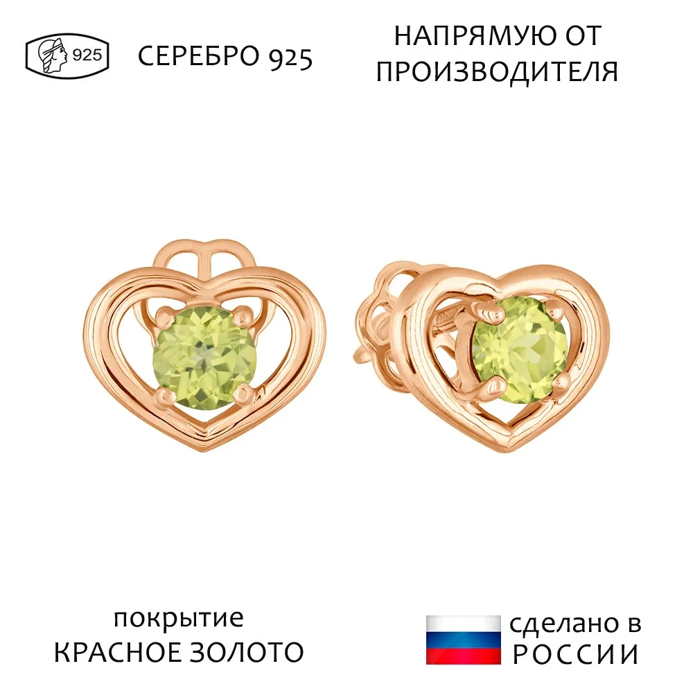 Серебряные серьги гвоздики (пусеты) с натуральным хризолитом - Сердце / покрытие Красное золото.