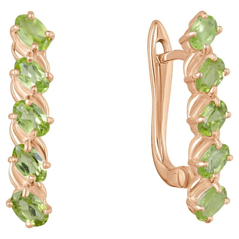 Серебряные серьги с натуральным хризолитом - коллекция Колосок. Серебряные серьги 925 пробы с покрытием красное золото. Цвет покрытия соответствует швейцарскому цветовому стандарту NIHS -5N и цвету красного золота 585 в России. На последней фотографии мы разместили сравнительную фотографию 3 цвета золотого покрытия. Помимо предания золотого цвета Вашему изделию, тонкий слой золота защищает от окисления. Для более стойкого эффекта золочения и долговечности покрытия мы дополнительно наносим подслой палладия (Pd). Средний вес изделия с камнями 4.28 гр. Месторождение: Хризолит (Якутия, Россия). Хризолит (Натуральный) овал 3*5 мм., средний вес: 0.22 карат. Все изделия собственного производства. Арт. 7975. Хризолит – камень, который называют «вечерним изумрудом» за удивительную способность менять цвет в зависимости от освещения. Считается, что хризолит очень любила Клеопатра. Хризолитовый порошок используется для общего восстановления организма, для очищения пищи от ядов и токсинов и улучшения работы ЖКТ. Кроме того, минерал защищает от опасностей и укрепляет дружеские отношения.