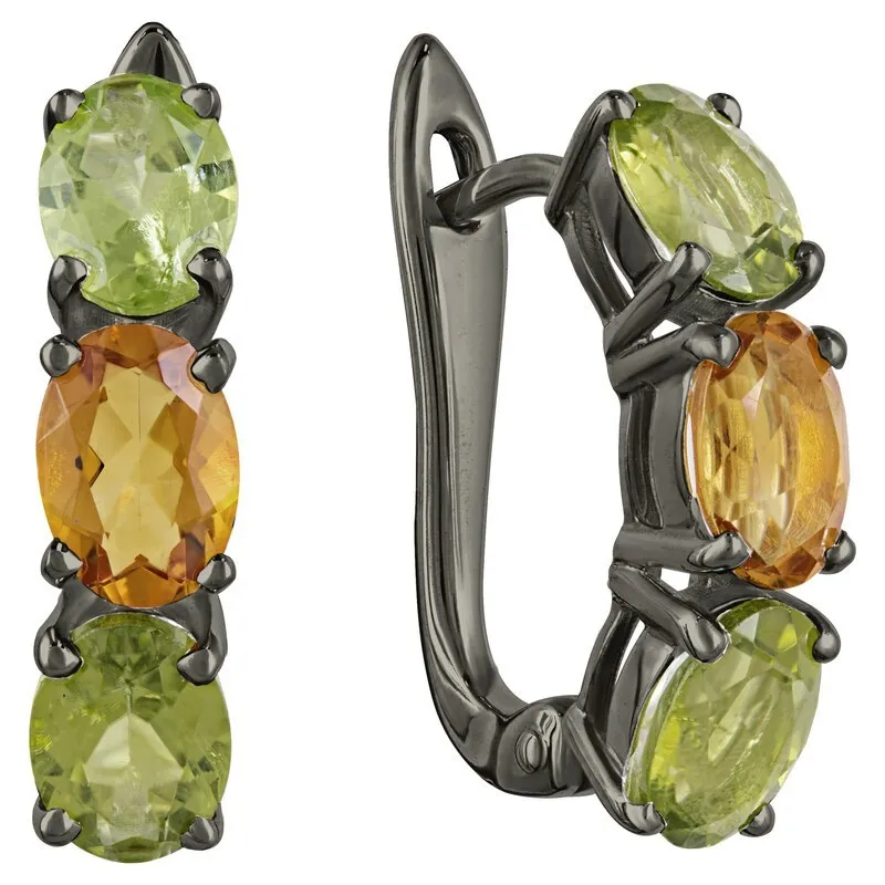 Серебряные серьги с натуральными камнями цитрин и хризолит - коллекция Муза, покрытие Черный Родий.