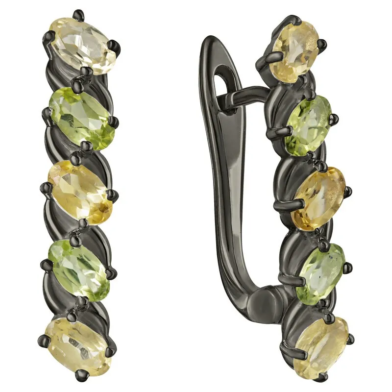 Серебряные серьги с натуральными камнями цитрин и хризолит - коллекция Колосок, покрытие Черный Родий.