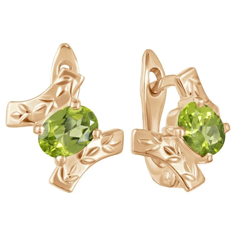 Серебряные серьги с натуральным хризолитом - коллекция Тея. Серебряные серьги 925 пробы с покрытием розовое золото. Цвет покрытия соответствует швейцарскому цветовому стандарту NIHS -4N и цвету розового золота 585 в России. На последней фотографии мы разместили сравнительную фотографию 3 цвета золотого покрытия. Помимо предания золотого цвета Вашему изделию, тонкий слой золота защищает от окисления. Для более стойкого эффекта золочения и долговечности покрытия мы дополнительно наносим подслой палладия (Pd). Средний вес изделия с камнями 3.76 гр. Месторождение: Хризолит (Якутия, Россия) Хризолит (Натуральный) овал 5*7 мм., средний вес: 0.85 карат. Все изделия собственного производства. Гарантия 12 месяцев.Арт. 8127. Хризолит – камень, который называют «вечерним изумрудом» за удивительную способность менять цвет в зависимости от освещения. Считается, что хризолит очень любила Клеопатра. Хризолитовый порошок используется для общего восстановления организма, для очищения пищи от ядов и токсинов и улучшения работы ЖКТ. Кроме того, минерал защищает от опасностей и укрепляет дружеские отношения.