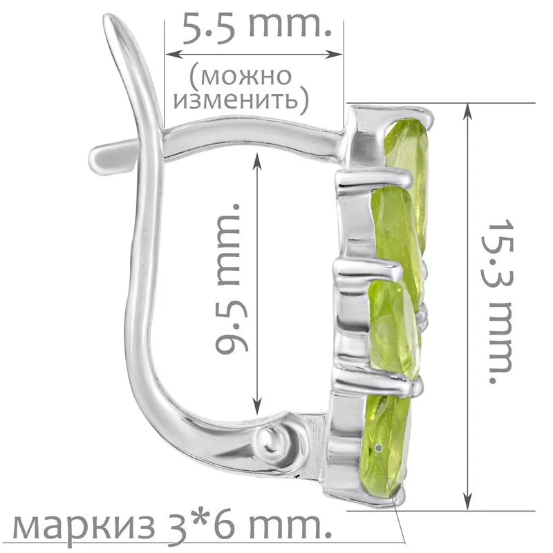 Серебряные серьги с натуральным хризолитом - коллекция Искра. Средний вес изделия с камнями 4.29 гр. Месторождение: Хризолит (Якутия, Россия) Хризолит (Натуральный) маркиз 3*6 мм., средний вес: 0.32 карат. Все изделия собственного производства. Гарантия 12 месяцев.Арт. 8144. Хризолит – камень, который называют «вечерним изумрудом» за удивительную способность менять цвет в зависимости от освещения. Считается, что хризолит очень любила Клеопатра. Хризолитовый порошок используется для общего восстановления организма, для очищения пищи от ядов и токсинов и улучшения работы ЖКТ. Кроме того, минерал защищает от опасностей и укрепляет дружеские отношения.