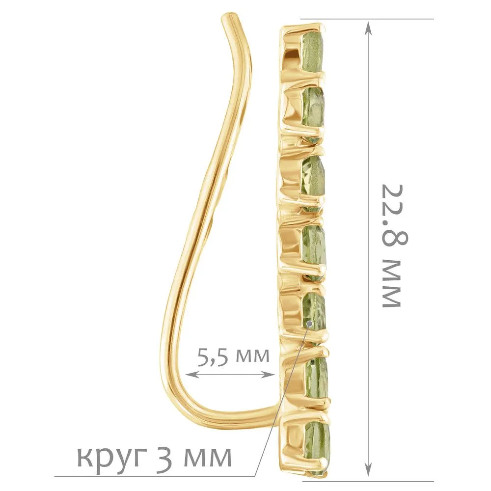 Серебряные серьги каффы с натуральным хризолитом - коллекция Волна / покрытие Желтое Золото.Средний вес украшения с камнями 1.75 гр.Месторождение: Хризолит (Якутия, Россия)Ювелирные вставки:Хризолит (Натуральный) круг 3 мм., средний вес: 0.75 карат.Все изделия собственного производства и имеют гарантию 12 месяцев. Арт. 8752YG . Хризолит – камень, который называют «вечерним изумрудом» за удивительную способность менять цвет в зависимости от освещения. Считается, что хризолит очень любила Клеопатра. Хризолитовый порошок используется для общего восстановления организма, для очищения пищи от ядов и токсинов и улучшения работы ЖКТ. Кроме того, минерал защищает от опасностей и укрепляет дружеские отношения.