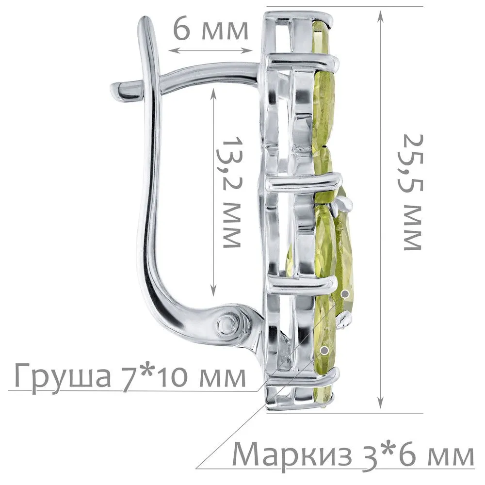 Серебряные серьги с натуральным хризолитом - коллекция Элегия / покрытие Чистое Серебро. Средний вес украшения с камнями 8.67 гр. Месторождение: Хризолит (Якутия, Россия) Ювелирные вставки: Хризолит (Натуральный) груша 7*10 мм., средний вес: 1.89 карат. Хризолит (Натуральный) маркиз 3*6 мм., средний вес: 0.25 карат. Все изделия собственного производства и имеют гарантию 12 месяцев. Арт. 8782AG . Хризолит – камень, который называют «вечерним изумрудом» за удивительную способность менять цвет в зависимости от освещения. Считается, что хризолит очень любила Клеопатра. Хризолитовый порошок используется для общего восстановления организма, для очищения пищи от ядов и токсинов и улучшения работы ЖКТ. Кроме того, минерал защищает от опасностей и укрепляет дружеские отношения.